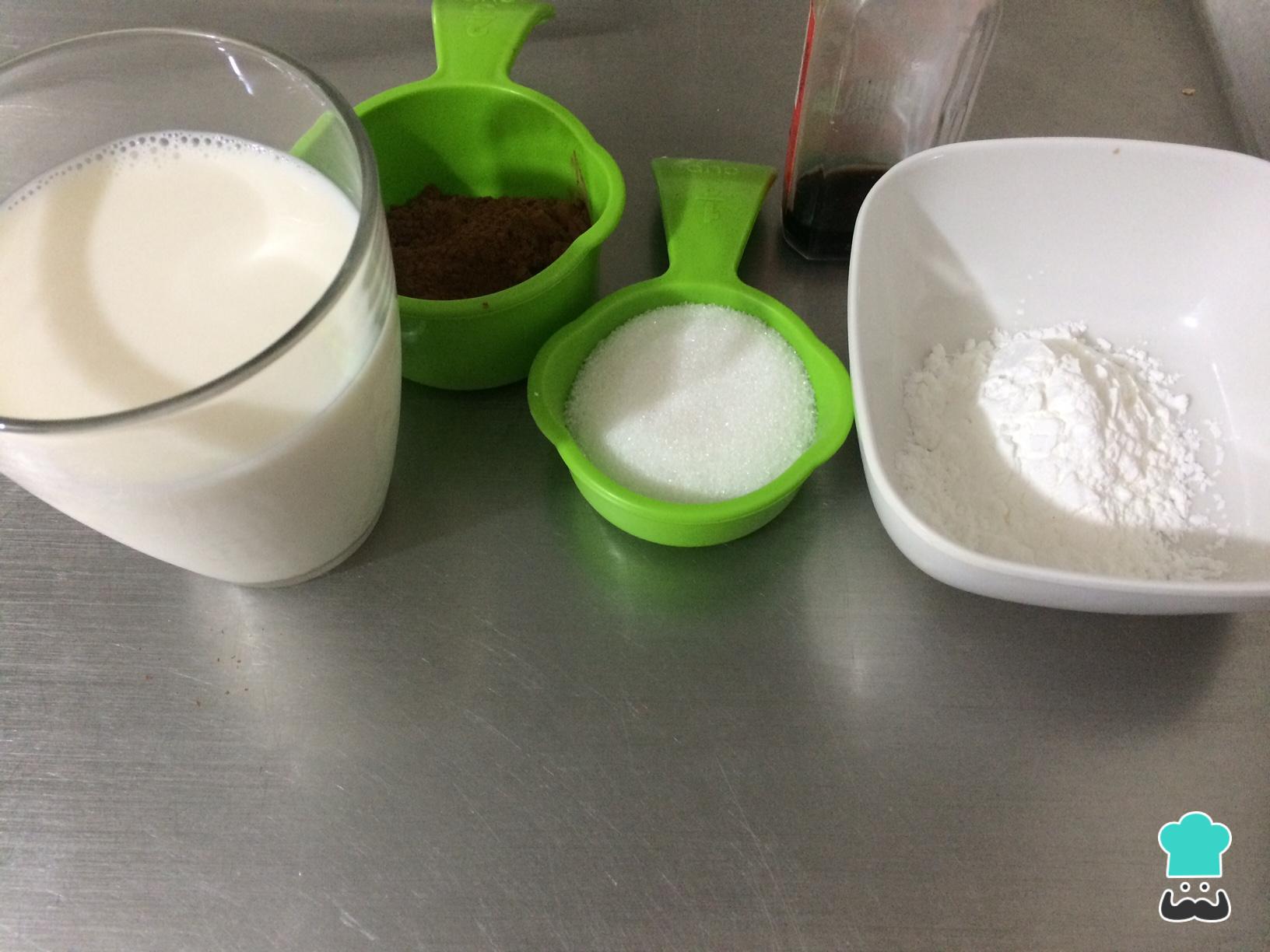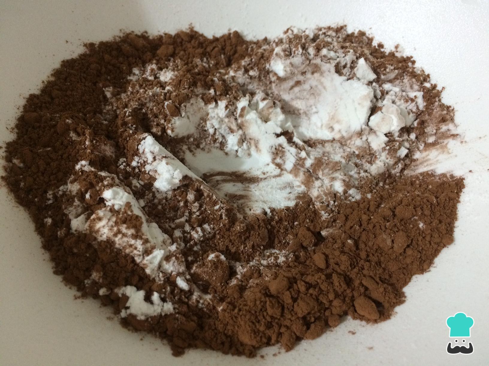Em uma tigela misture os ingredientes secos, ou seja, o cacau, o amido de milho e o açúcar. Reserve.