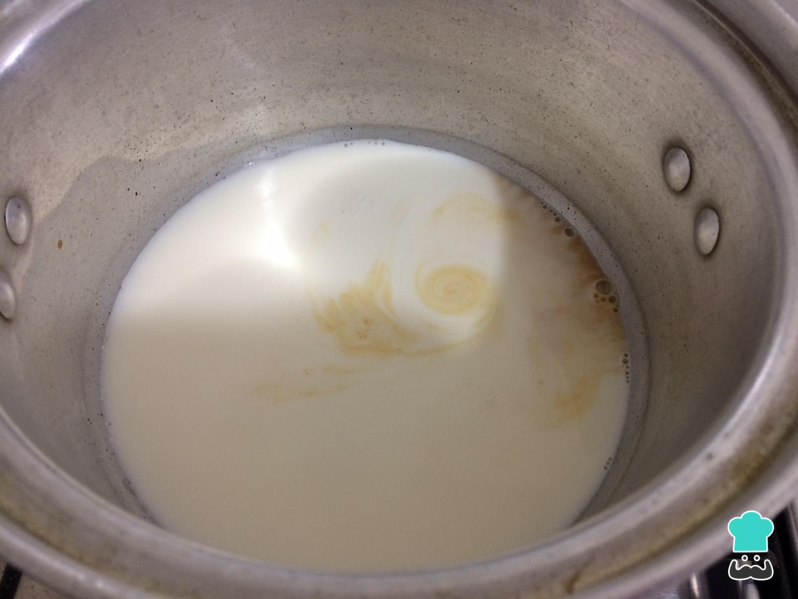 Em seguida coloque em uma panela o leite e a essência de baunilha, leve ao fogo e espere ferver.