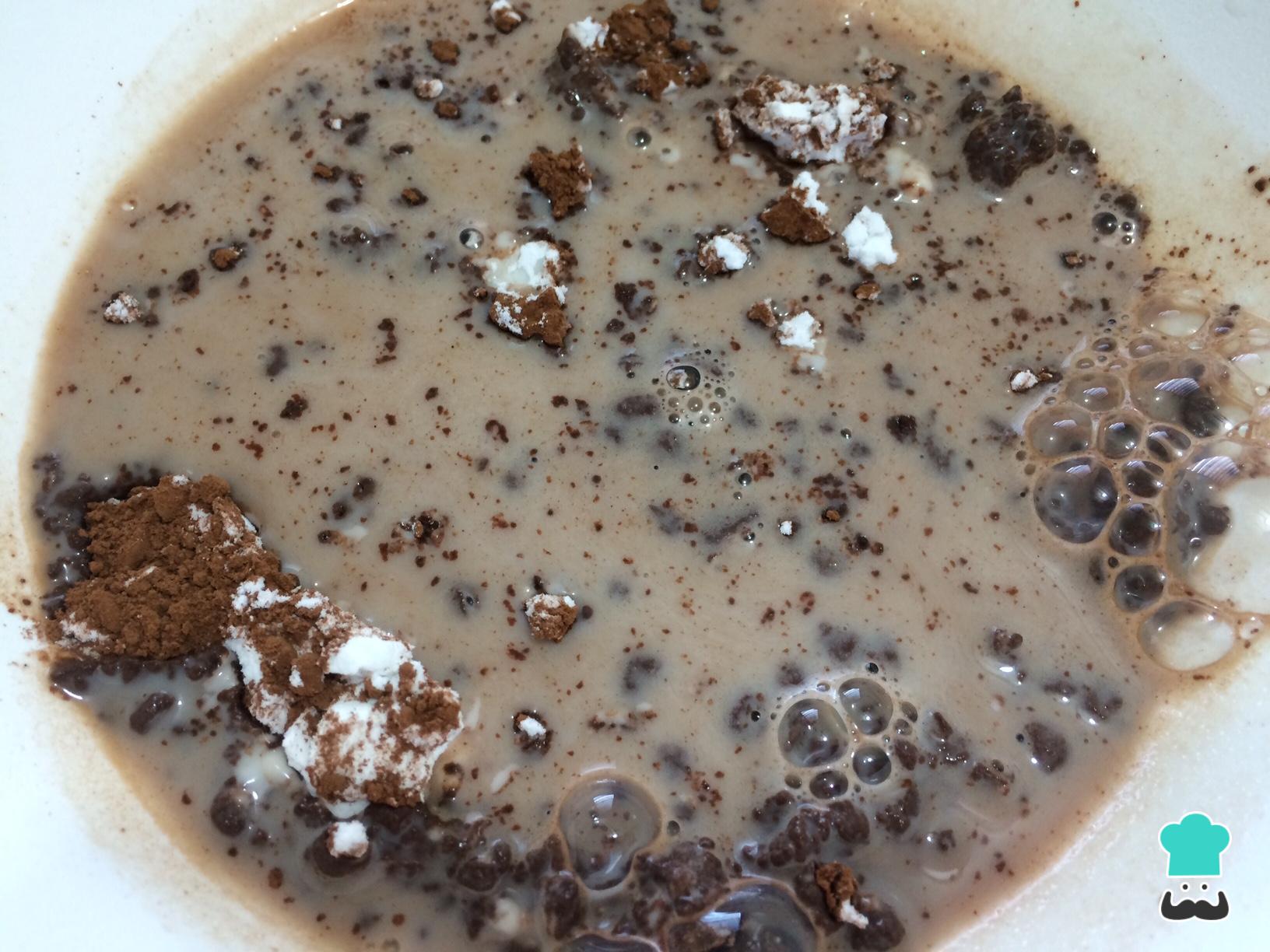 Adicione um pouco de leite fervente aos ingredientes secos e mexa muito bem, de preferência com um batedor manual, para dissolver os grumos.