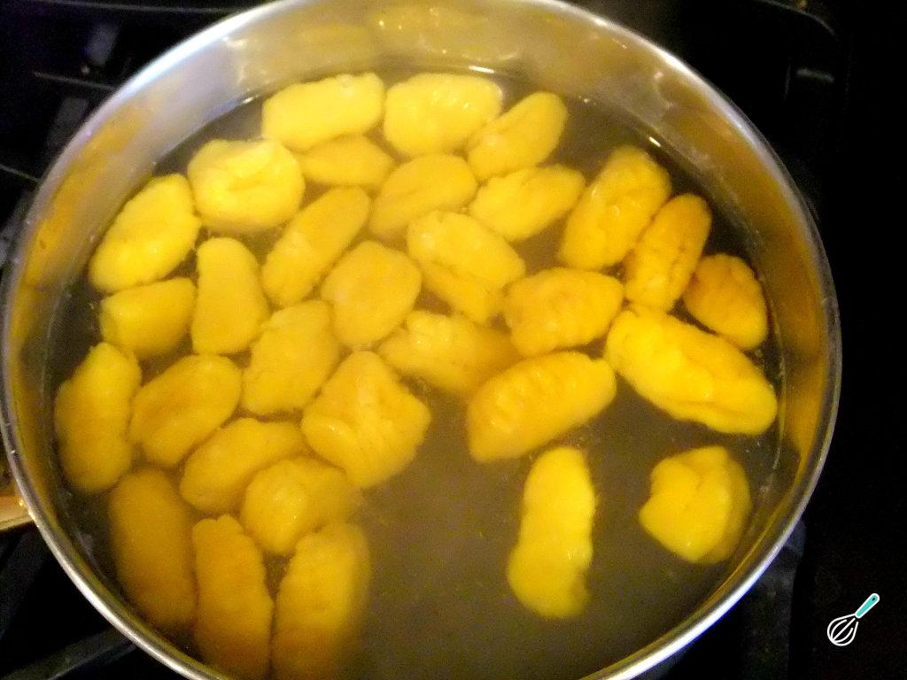 Cozinhe o nhoque numa panela ao fogo médio com água abundante e retire para um prato quando subirem à superfície (isso significa que está cozinhado).