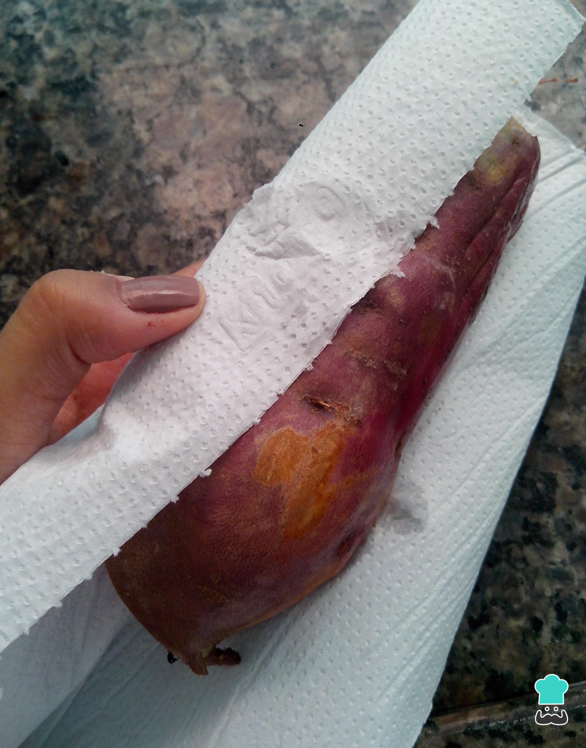 Para fazer este nhoque de batata doce rápido comece por lavar a batata doce, enrolar em um papel toalha e levar cerca de 3-4 minutos no microondas para cozinhar.