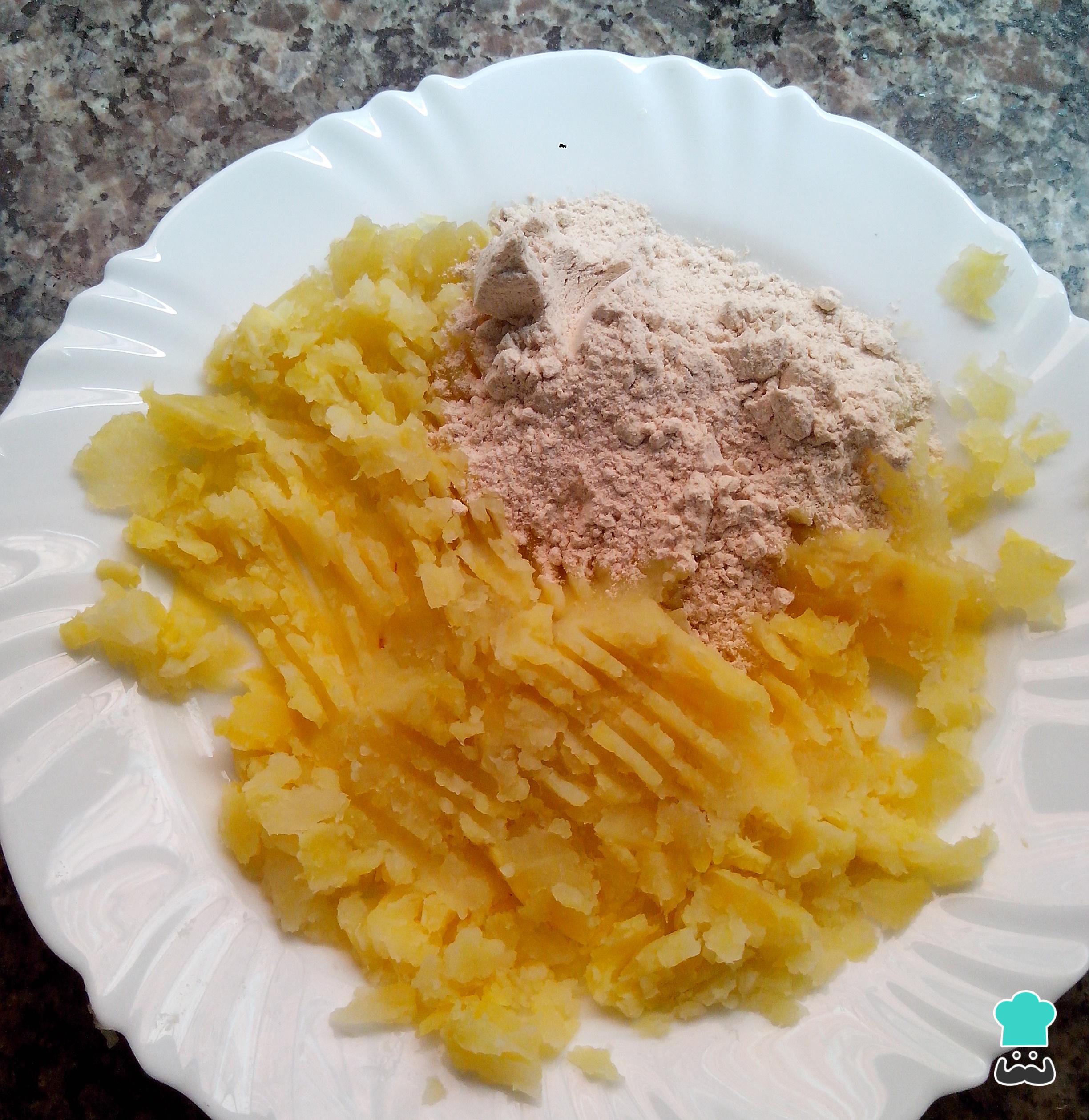 Deixe esfriar, descasque a batata e amasse no garfo. Em seguida junte a farinha, o azeite e o sal.