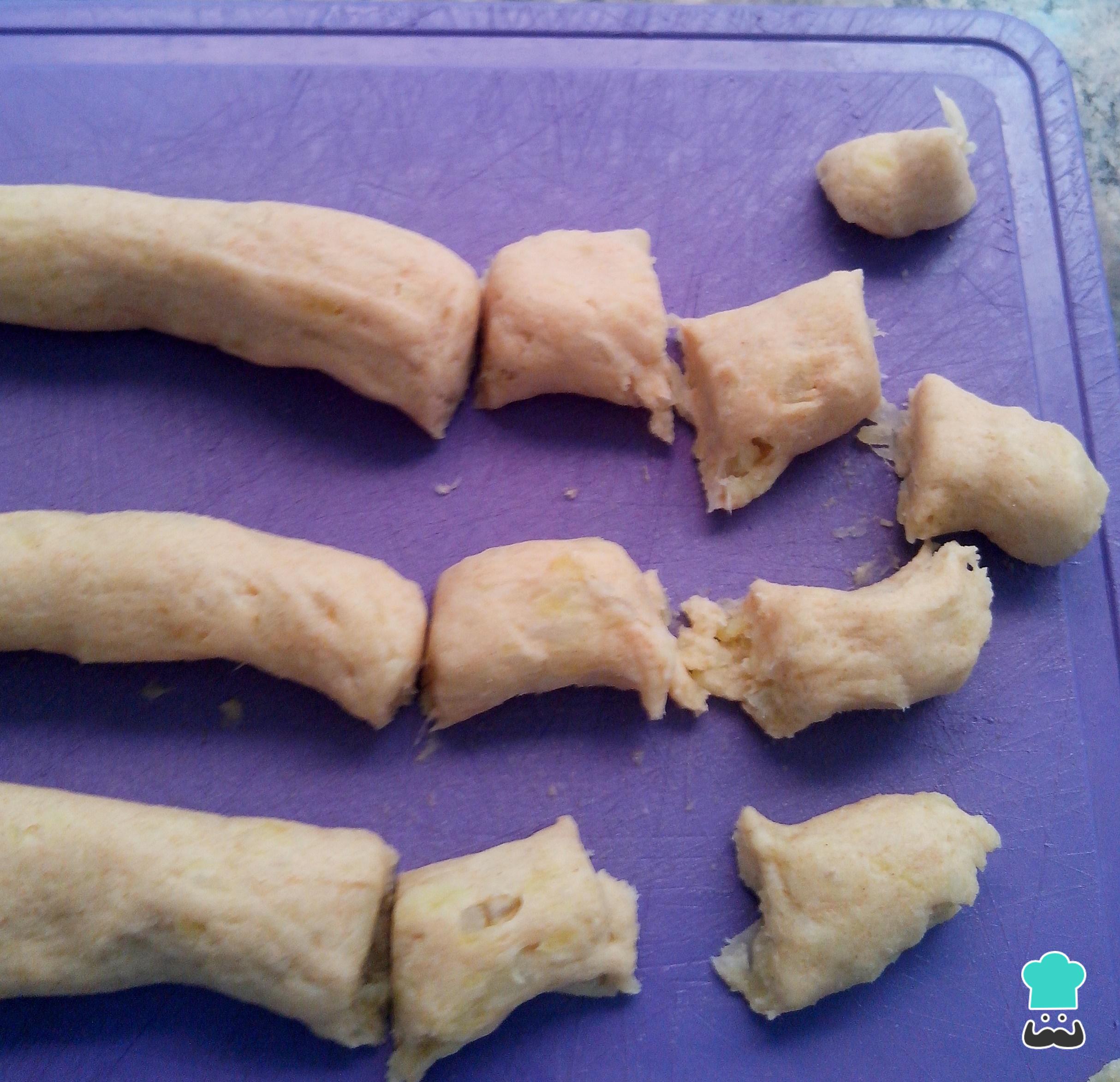 Separe a bola de massa em vários rolinhos e corte em formato de nhoque.