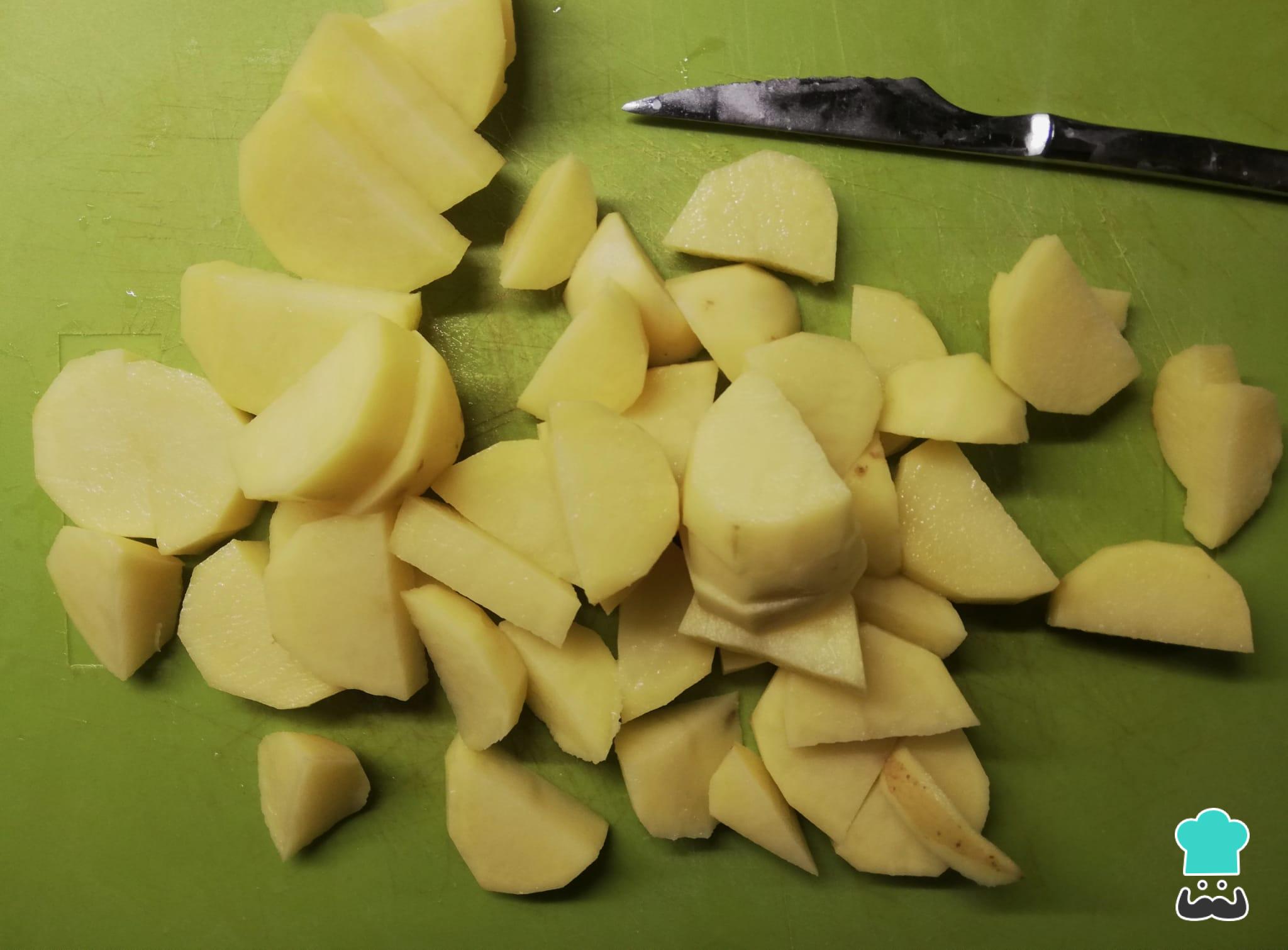 O primeiro passo é cortar as batatas em fatias, pois assim as mesmas vão cozinhar mais rápido. Depois é só ferver as batatas até que fiquem cozidas. Escorra, coloque-as em um recipiente fundo e deixe que as mesmas esfriem por, pelo menos, 30 minutos.