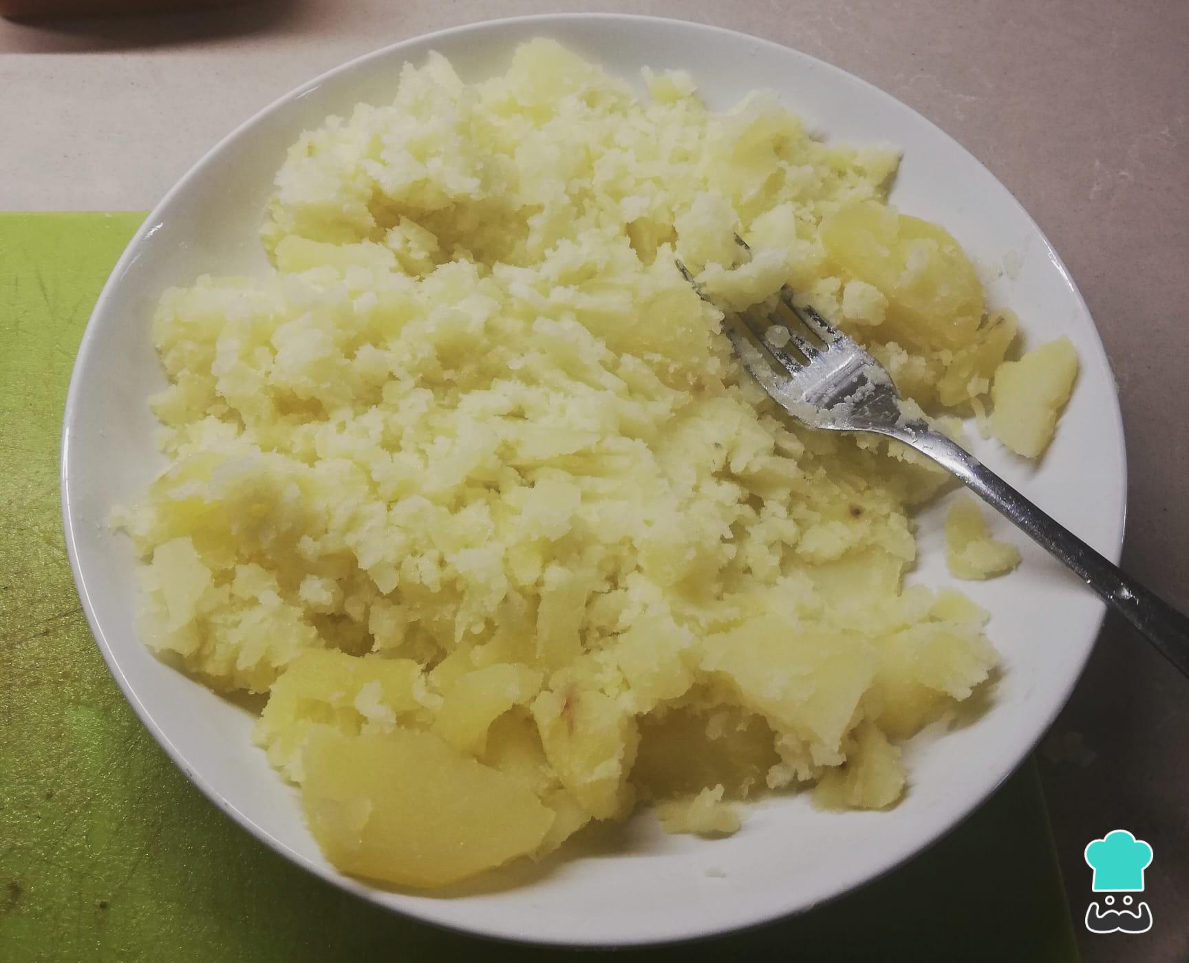 Agora amasse as batatas com um garfo e misture a farinha, o azeite e o sal. Numa superfície lisa coloque um pouco de farinha e espalhe. Isso será necessário para abrir a massa.