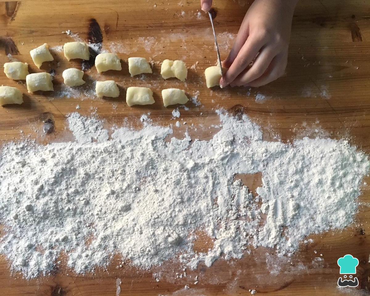 Separe a massa em pequenas porções e faça rolinhos longos e finos. Corte os nhoques com mais ou menos 2 cm de largura, ou com a medida de dois dedos na horizontal.