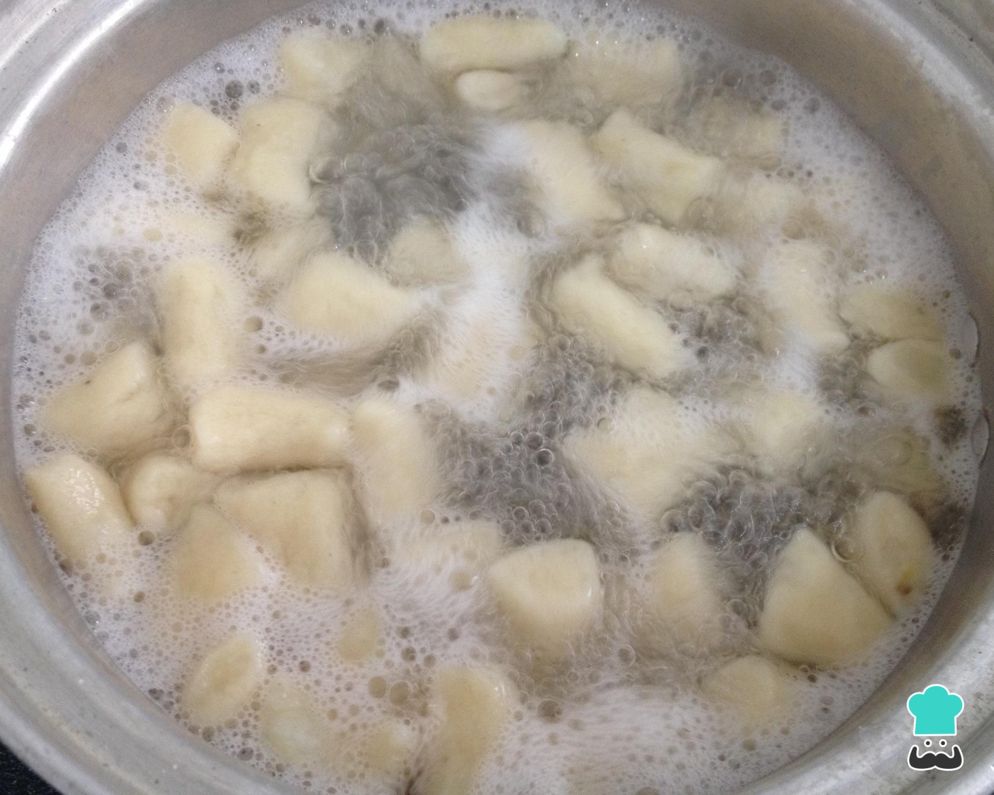 Coloque uma panela com bastante água para ferver e, quando estiver fervendo, acrescente sal e os nhoques. O ponto para saber se o nhoque já está cozido é quando os mesmos sobem à superfície, como na foto. Retire-os delicadamente com uma colher ou espumadeira.
