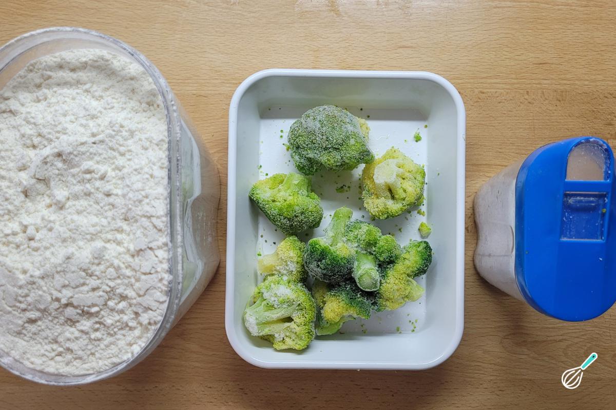 Separe os ingredientes para fazer seu nhoque de brócolis. Aqui usei floretes de brócolis que estavam branqueados e congelados. Você pode usar o brócolis congelado ou fresco. A quantidade de farinha vai depender de alguns fatores, como o tamanho do brócolis, do quanto você cozinhou, do quanto deixou secar a água etc.