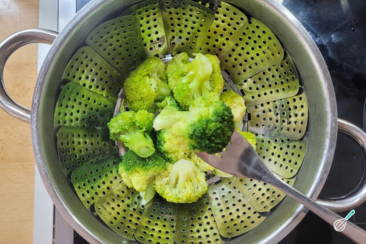 O primeiro passo é cozinhar o brócolis. O ideal para essa receita - independente se estiver usando o brócolis congelado ou fresco - é cozinhar no vapor e não na água. Assim, o brócolis absorve menos água, fazendo com que precise usar menos farinha. Além disso, cozinhar no vapor preserva mais a cor e os nutrientes.