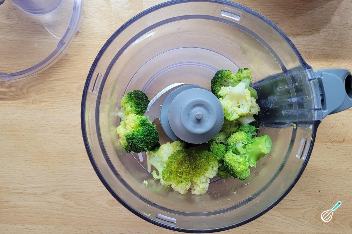 Transfira o brócolis cozido para um processador e adicione o sal.
