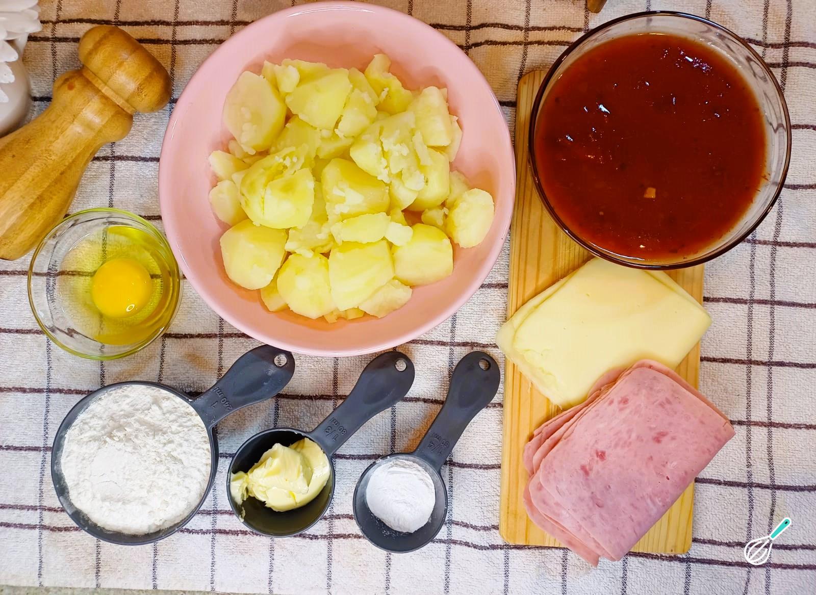 Separe todos os ingredientes necessários para o preparo do nhoque de forno na travessa.