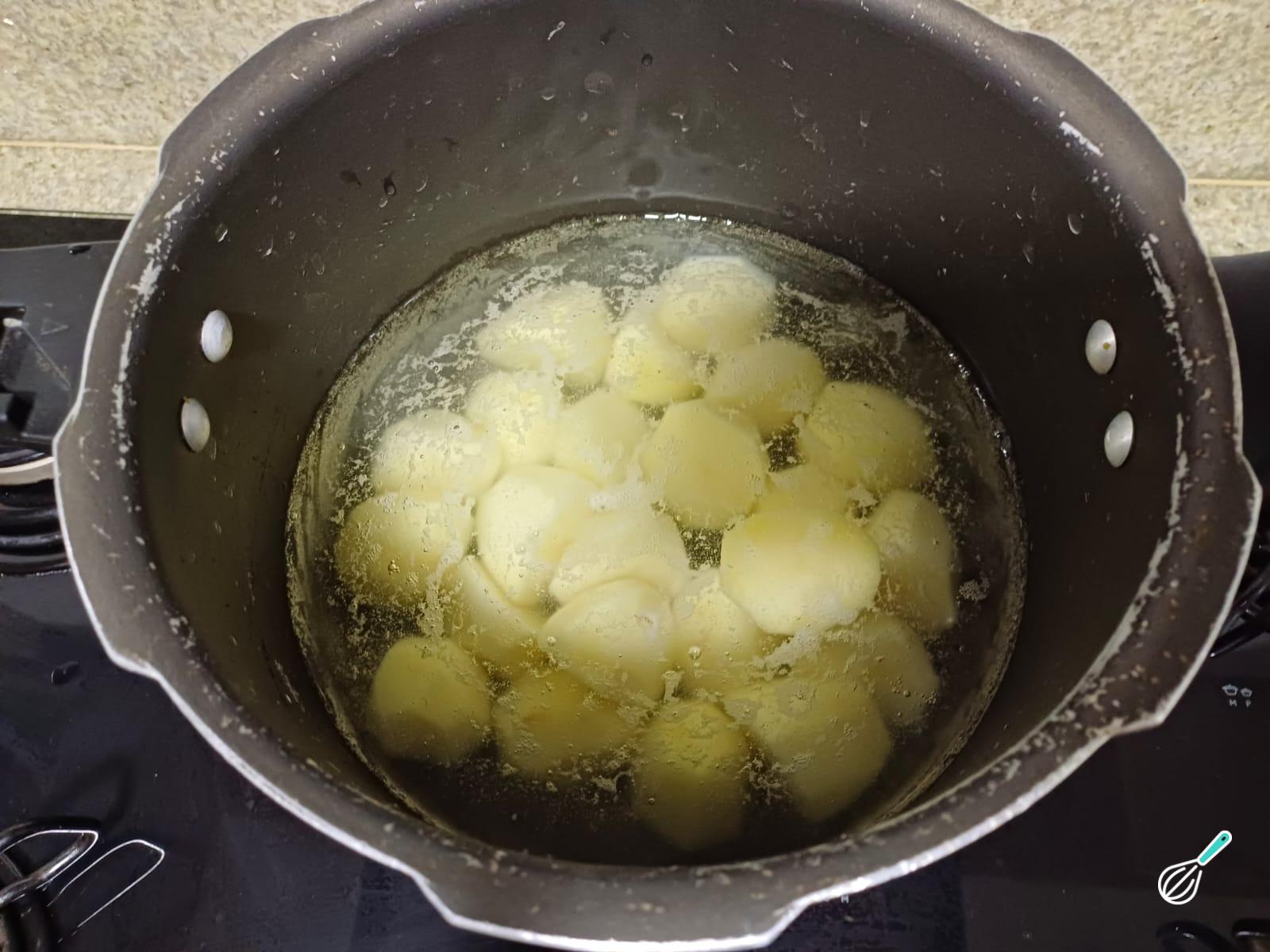 Descasque e corte as batatas em cubos e coloque em uma panela grande com água e sal, e deixe em fogo médio por aproximadamente 20-25 minutos, até que fiquem cozidas e macias. Caso queira diminuir o tempo de cozimento, utilize uma panela de pressão.