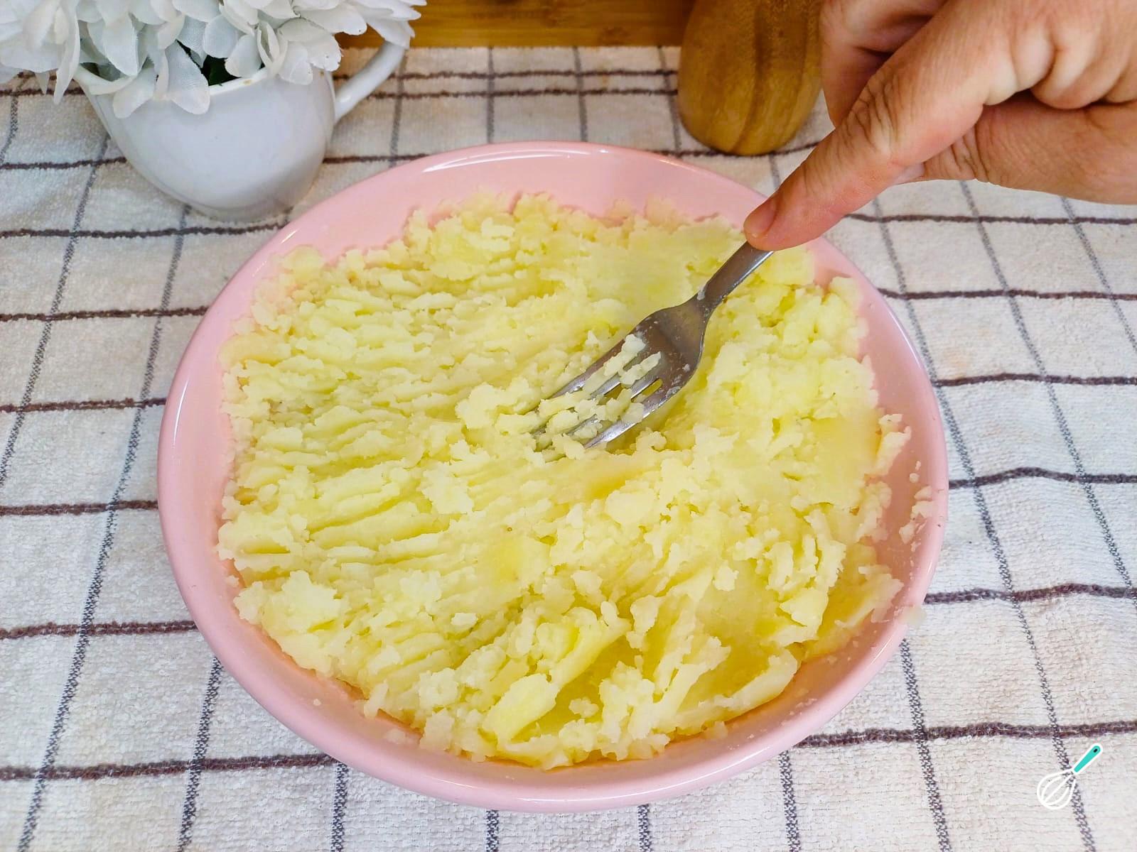 Em uma tigela grande, amasse bem as batatas com auxílio de um garfo ou espremedor de batatas, até que forme um purê liso e homogêneo.