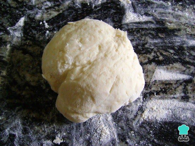 O passo seguinte do nhoque de mandioca é transferir a mistura para uma superfície lisa e enfarinhada e acrescentar a farinha, pouco a pouco, enquanto sova. O ideal é obter uma massa lisa que desgruda, pelo que poderá não ser necessário usar toda a farinha, ou usar mais.