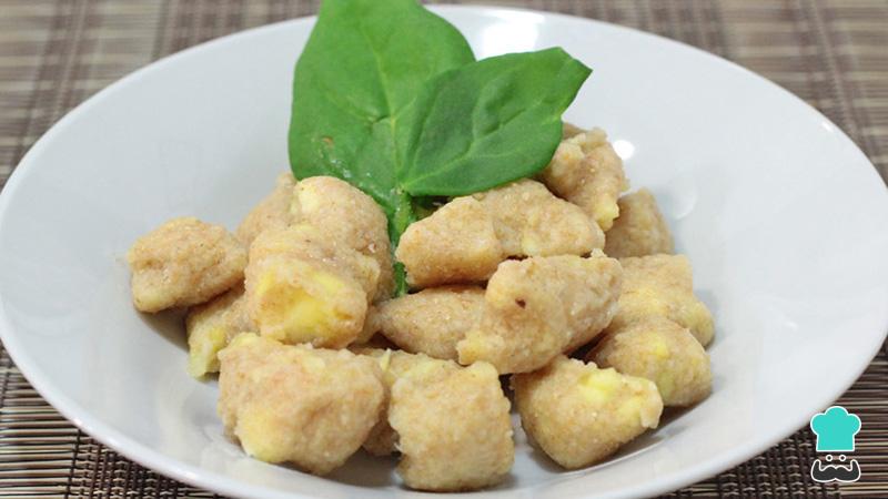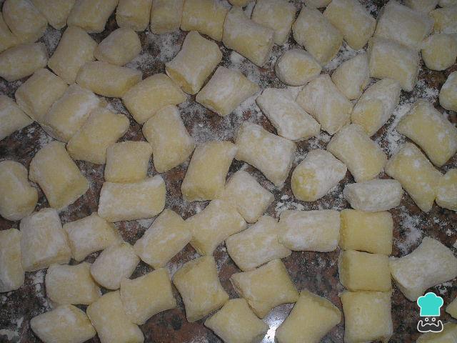 Separe a massa em quatro partes, enrole e corte pedacinhos de nhoque, como na fotografia. Cozinhe numa panela em fogo médio com água fervente, e retire quando subirem à superfície.