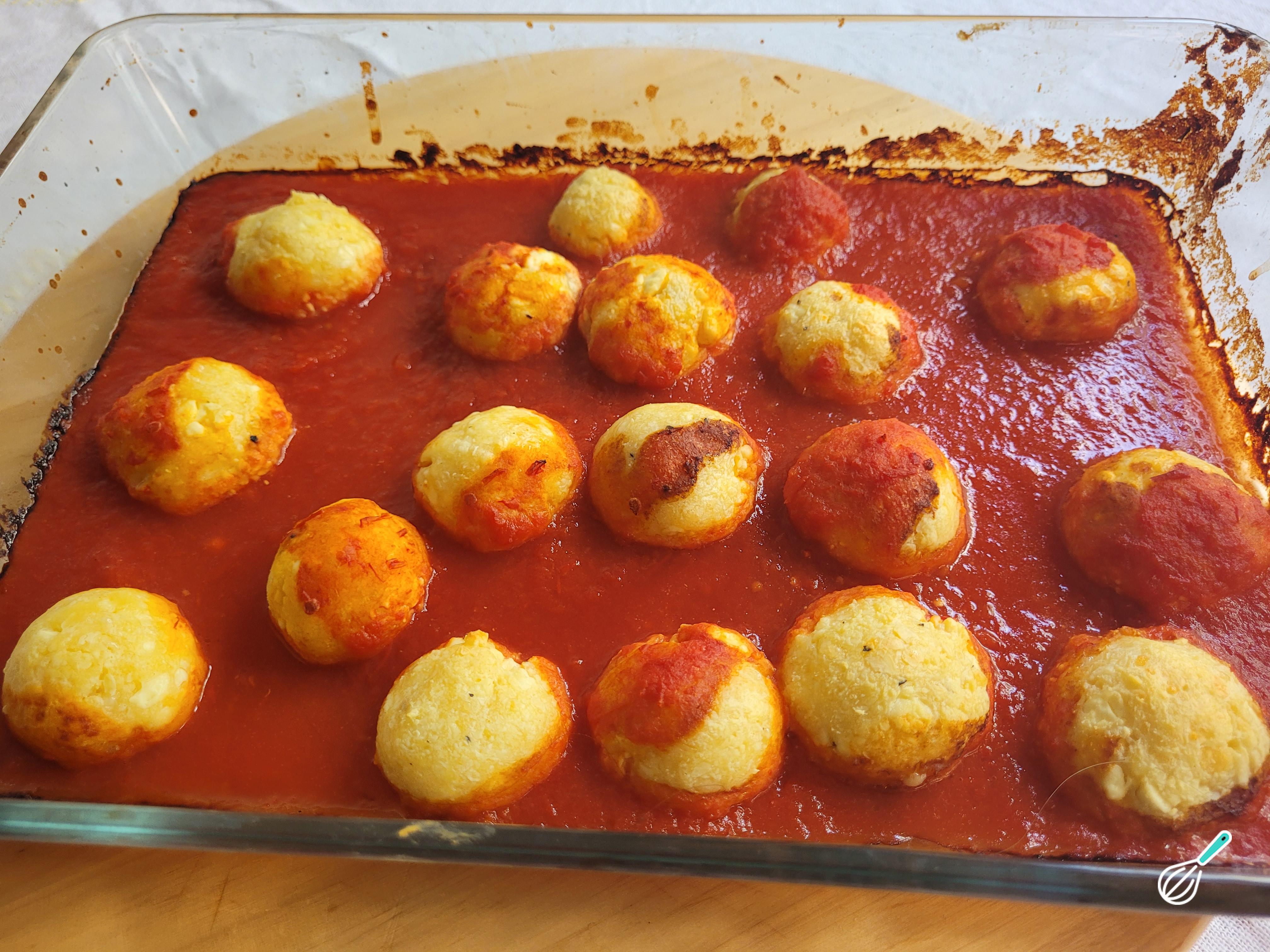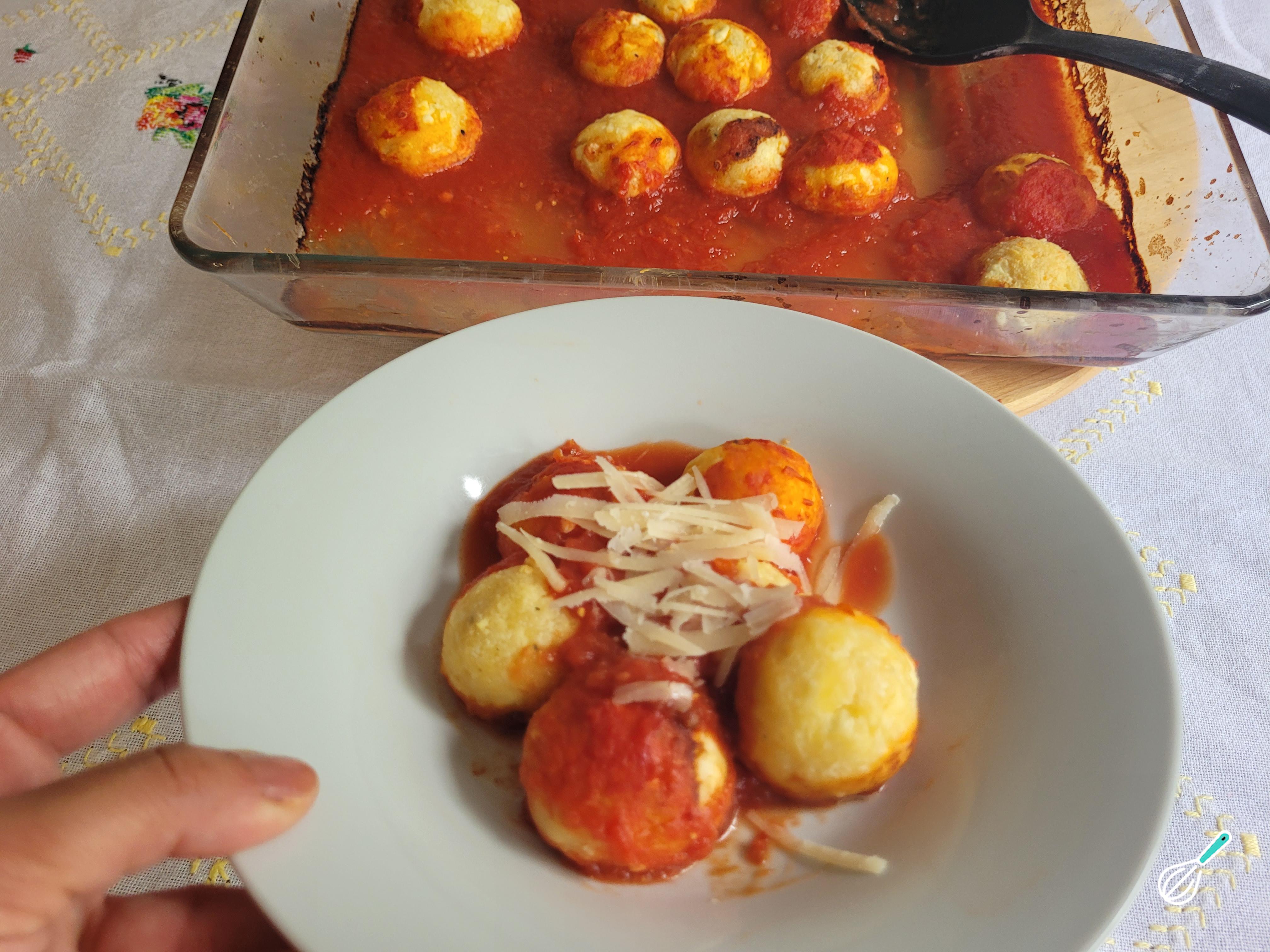 Como as bolinhas são delicadas, um dos meus métodos favoritos de preparar é cozinhar direto no forno com o molho de tomate. Além de não correr o risco das bolinhas desmancharem ao serem colocadas para cozinhar na água, ainda é muito prático, não suja quase nada e as bolinhas ganham uma casquinha crocante e ligeiramente douradinha!