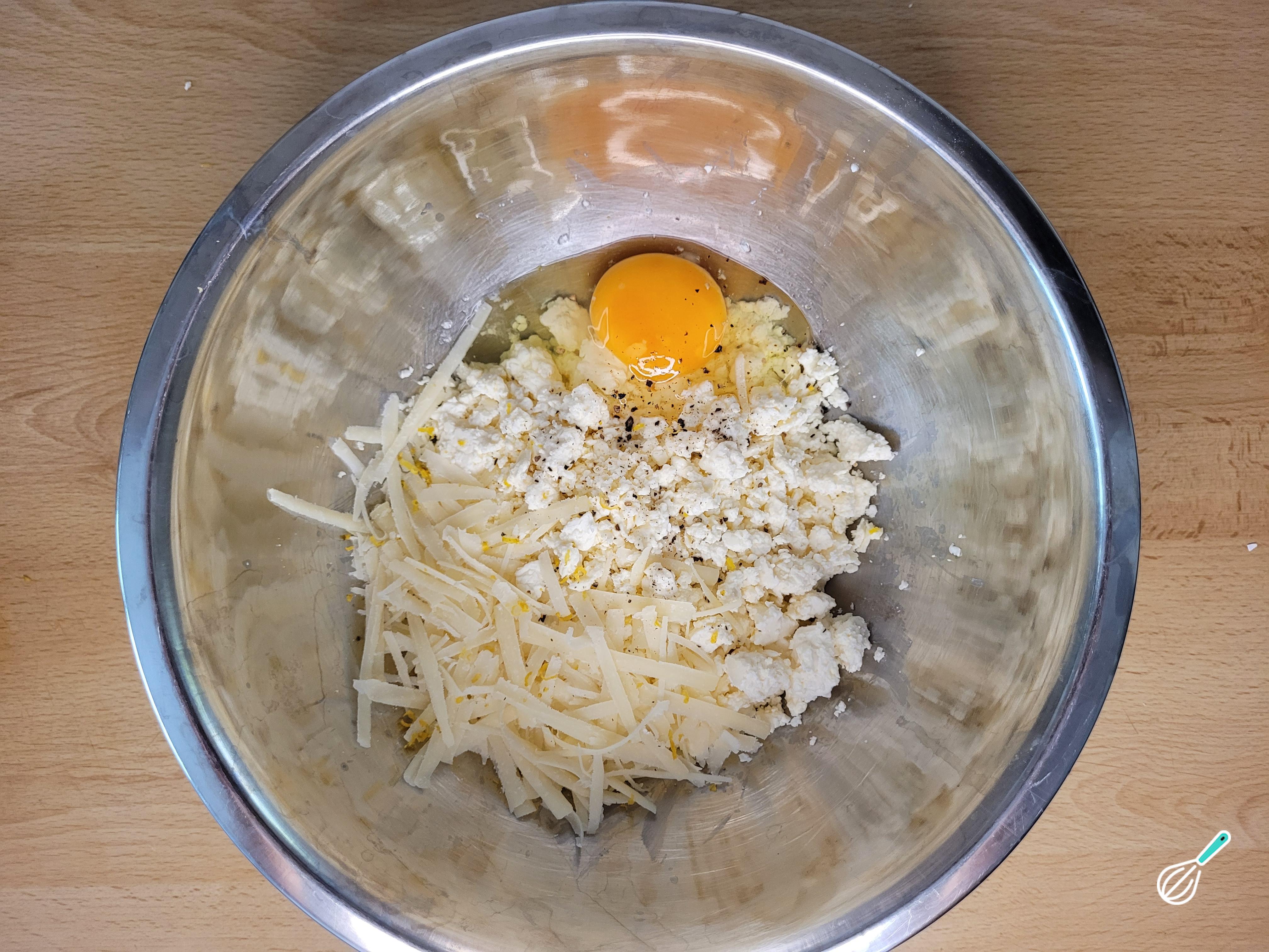 Em uma tigela, comece esfarelando a ricota. Adicione o queijo parmesão e o ovo. Adicione as raspas de limão e tempere com sal e pimenta do reino a gosto. Misture com as mãos e comece adicionando a farinha de trigo aos poucos.