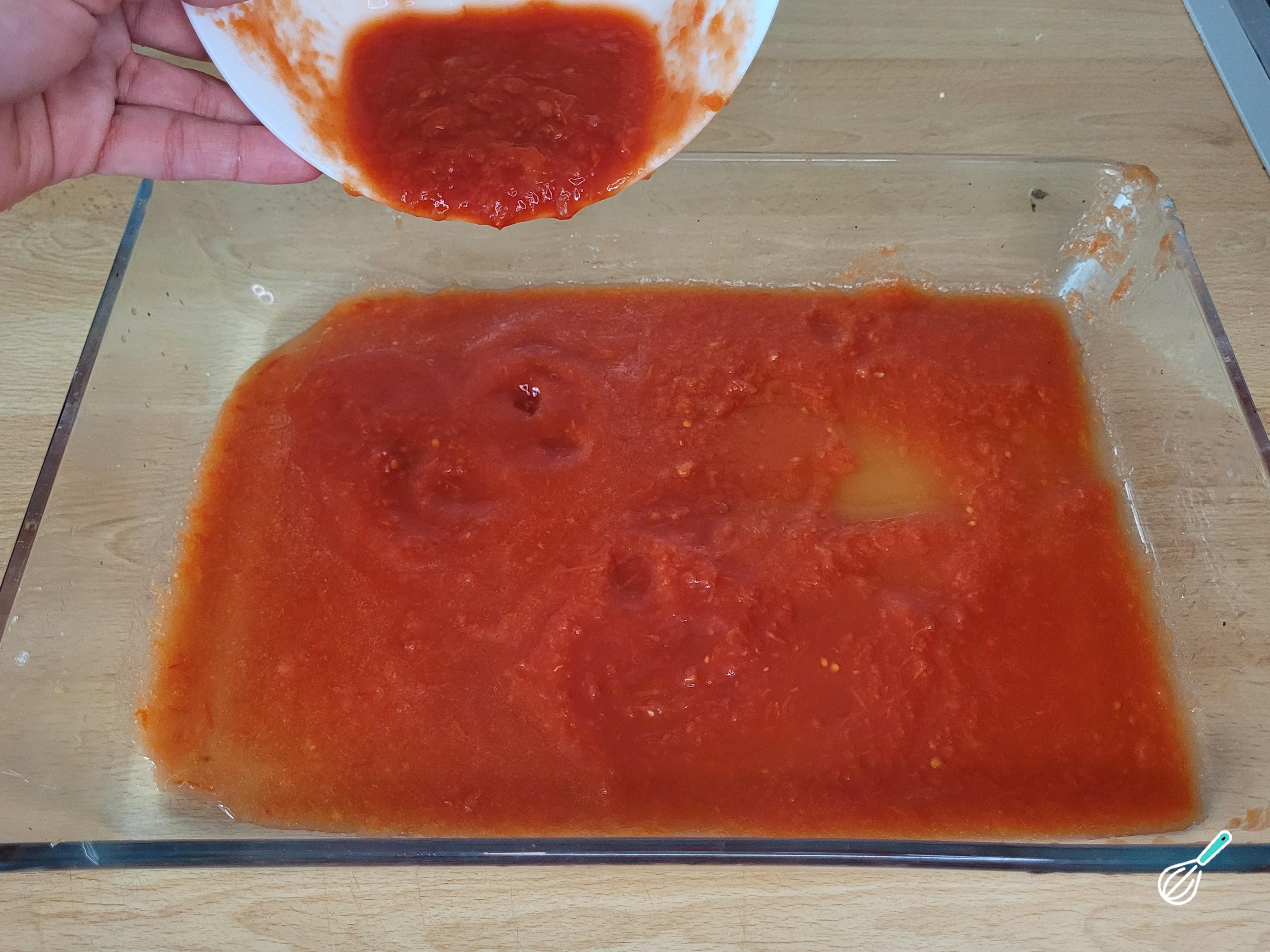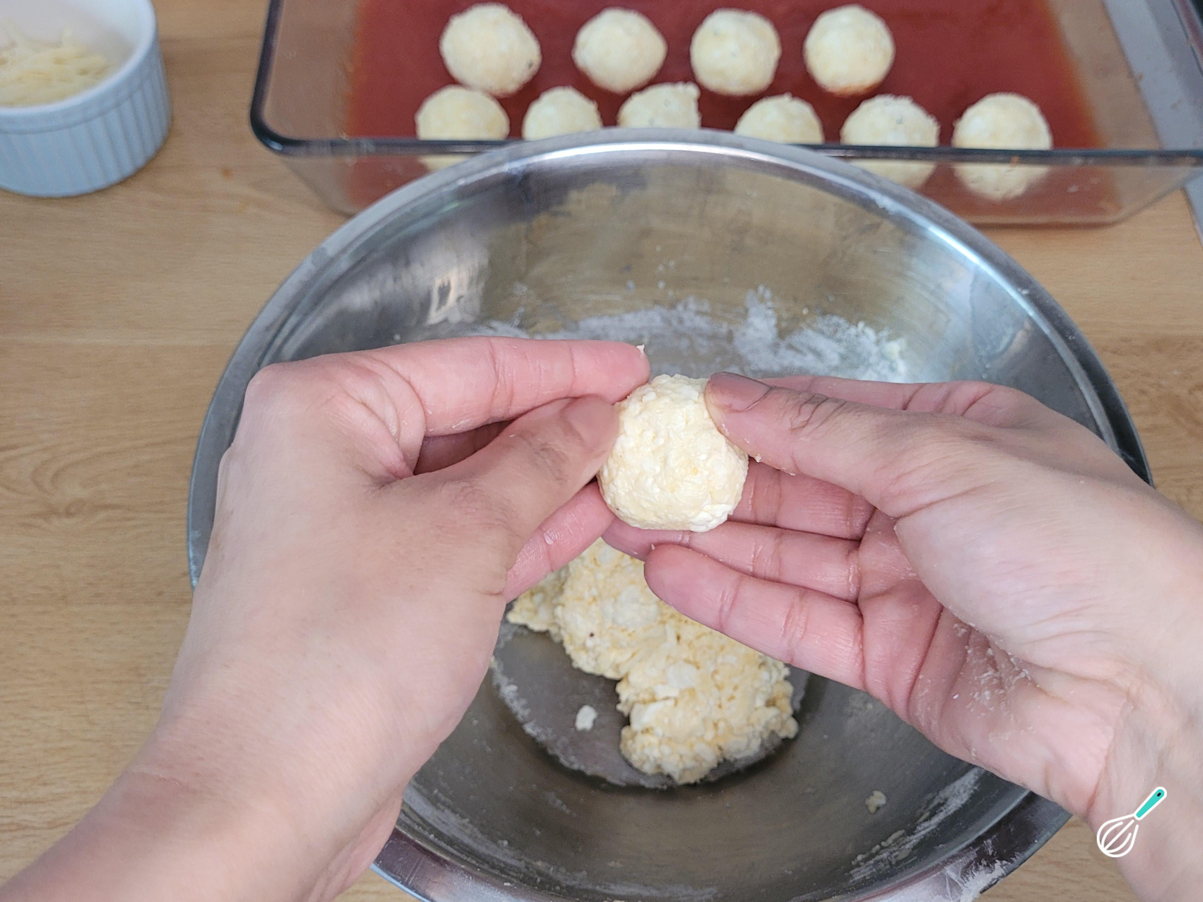 Comece a modelar as bolinhas do formato que quiser a vá colocando na assadeira sobre o molho de tomate.