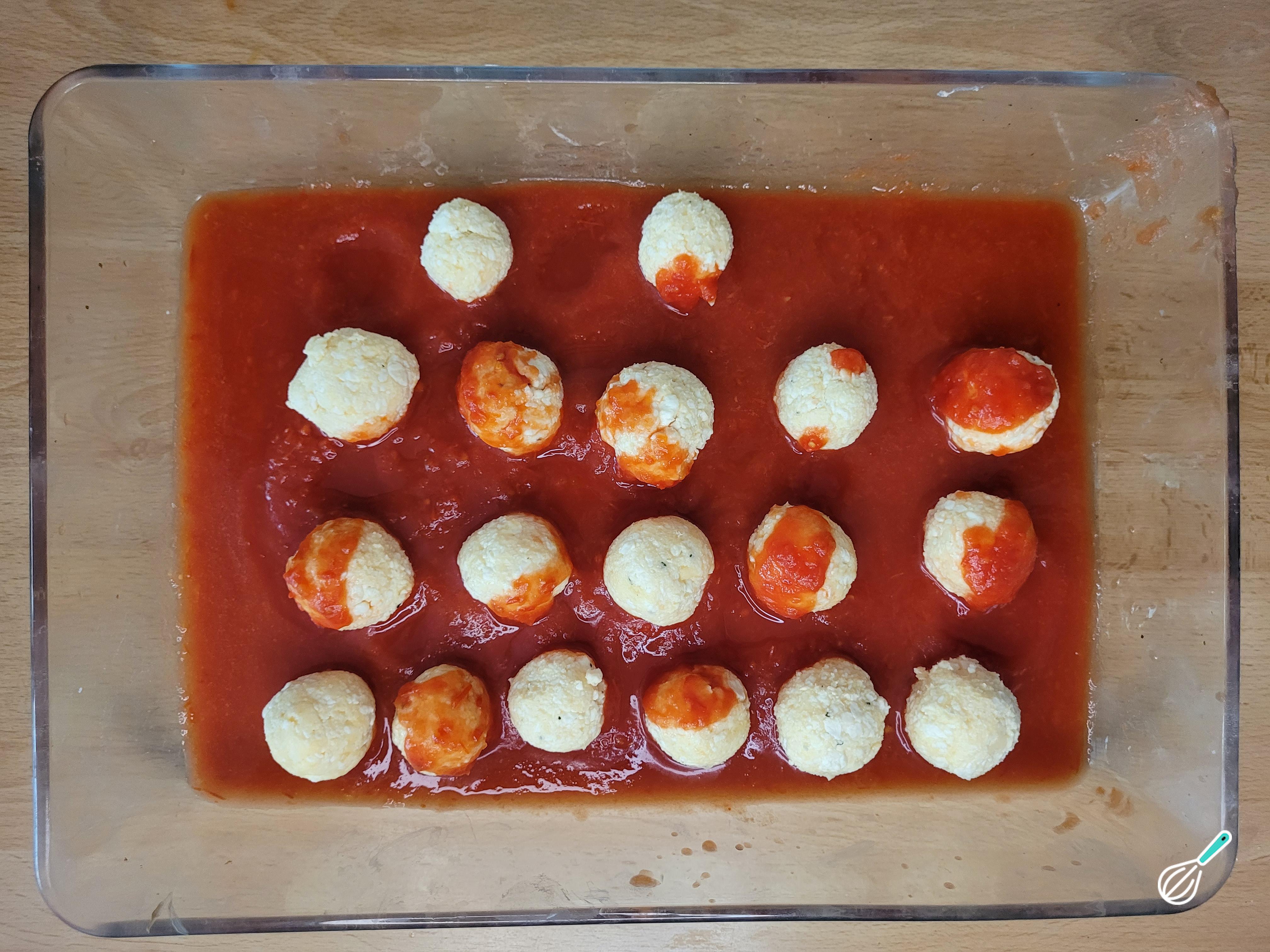 Depois que terminar de modelar, cubra com um pouco mais de passata de tomate e leve para o forno preaquecido a 180oC até que as bolinhas estejam firmes.
