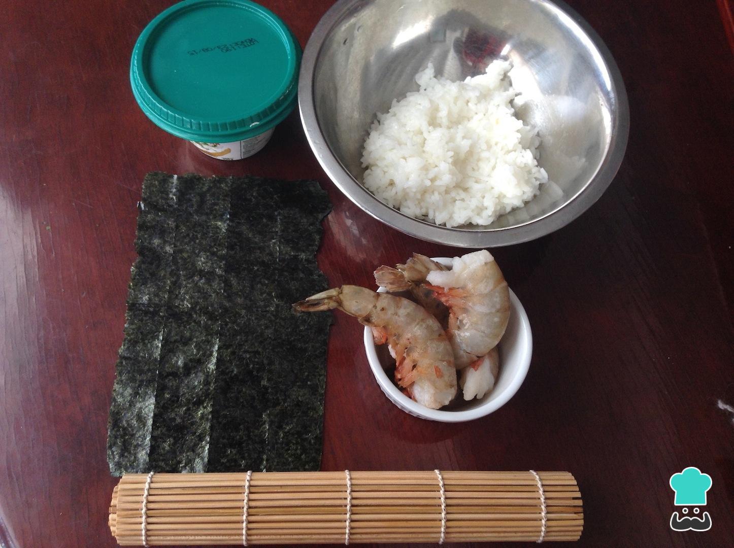 O primeiro passo para fazer esta receita de niguiri de camarão é reunir os ingredientes. O arroz para sushi é cozinhado de um jeito diferente do arroz comum, por isso, se você não souber como cozinhar arroz pra sushi, confira nossa receita.