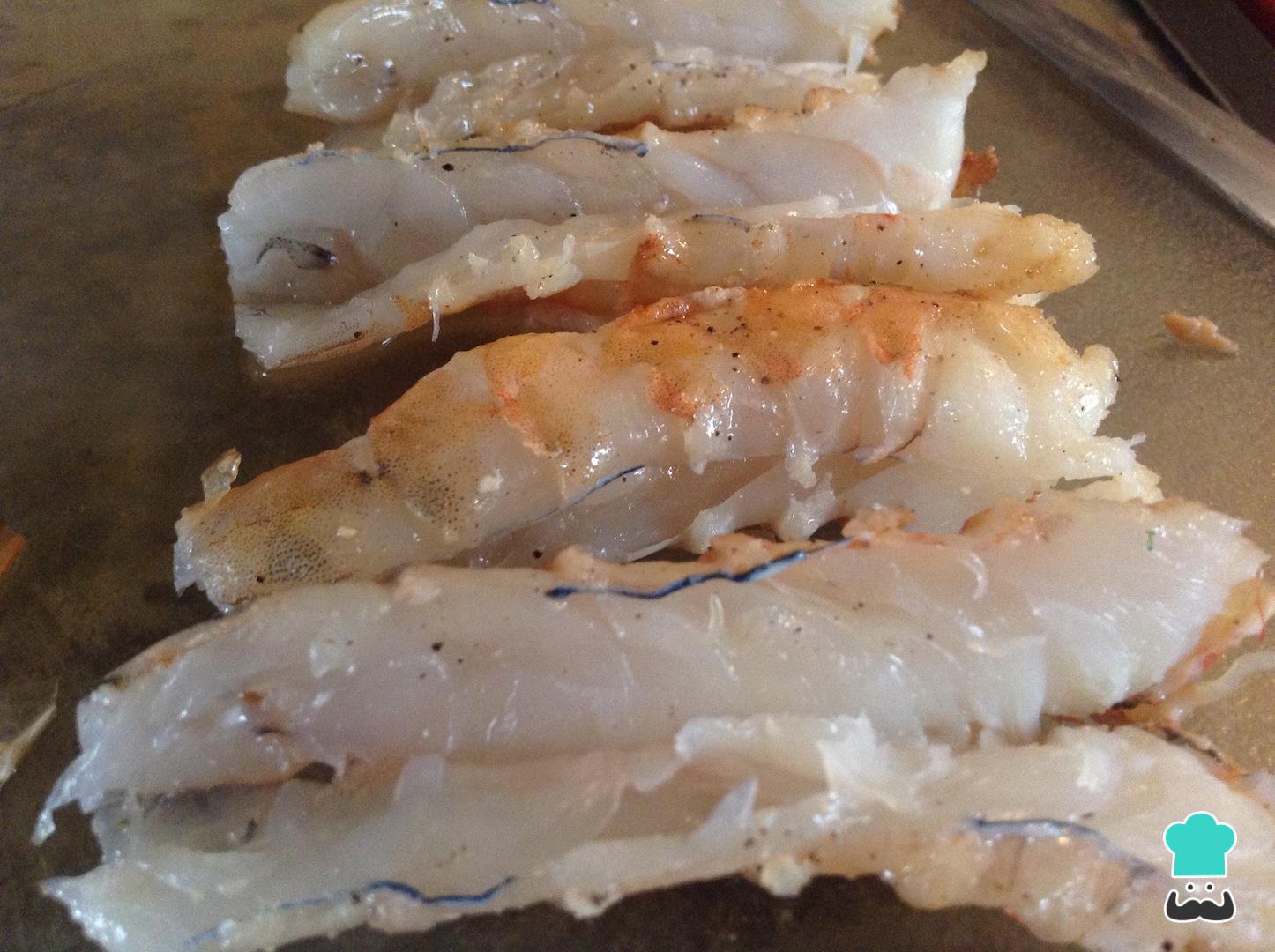 Depois o passo anterior, retire os camarões da frigideira, remova o palito e faça um corte na parte de baixo, para os abrir. Reserve.