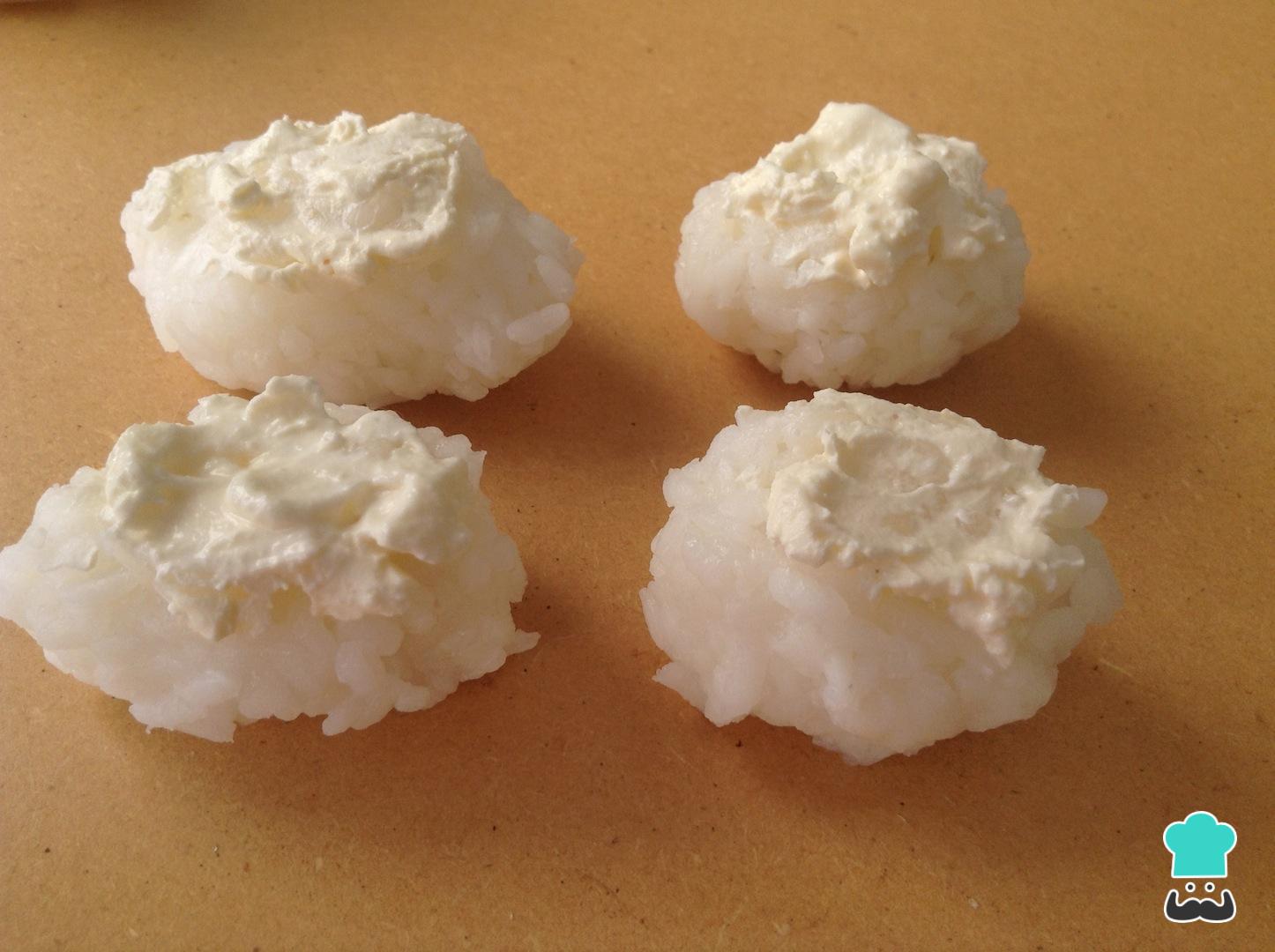 Para montar os niguiris, modele o arroz em bolinhos e espalhe um pouco de cream cheese sobre eles (este ingrediente ajuda a grudar o camarão no arroz).