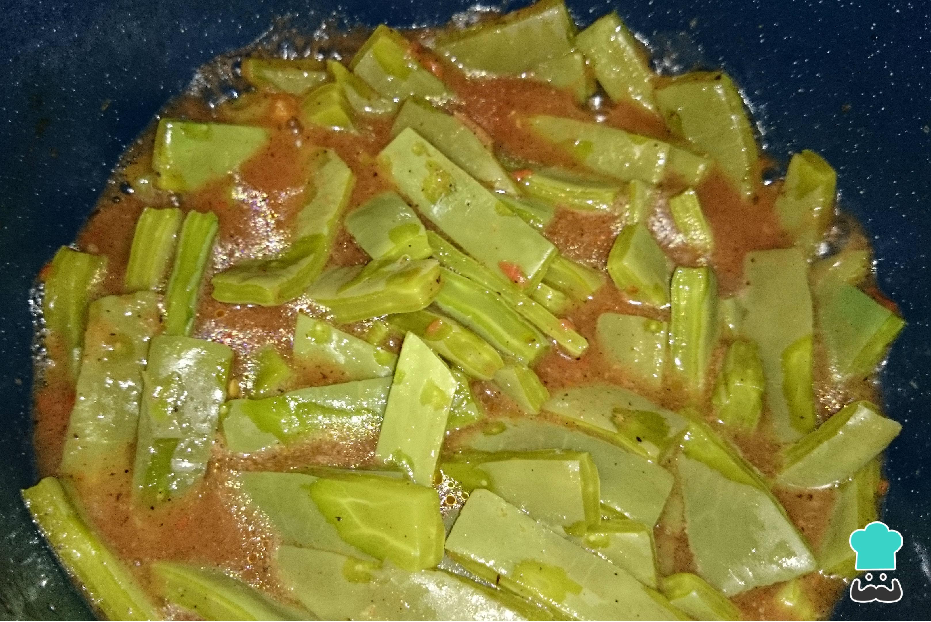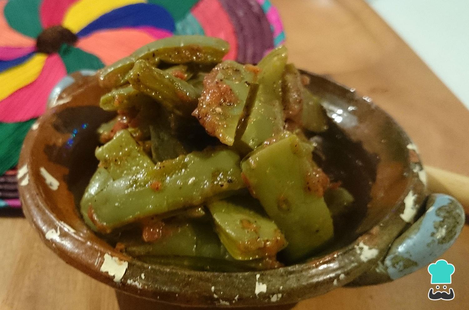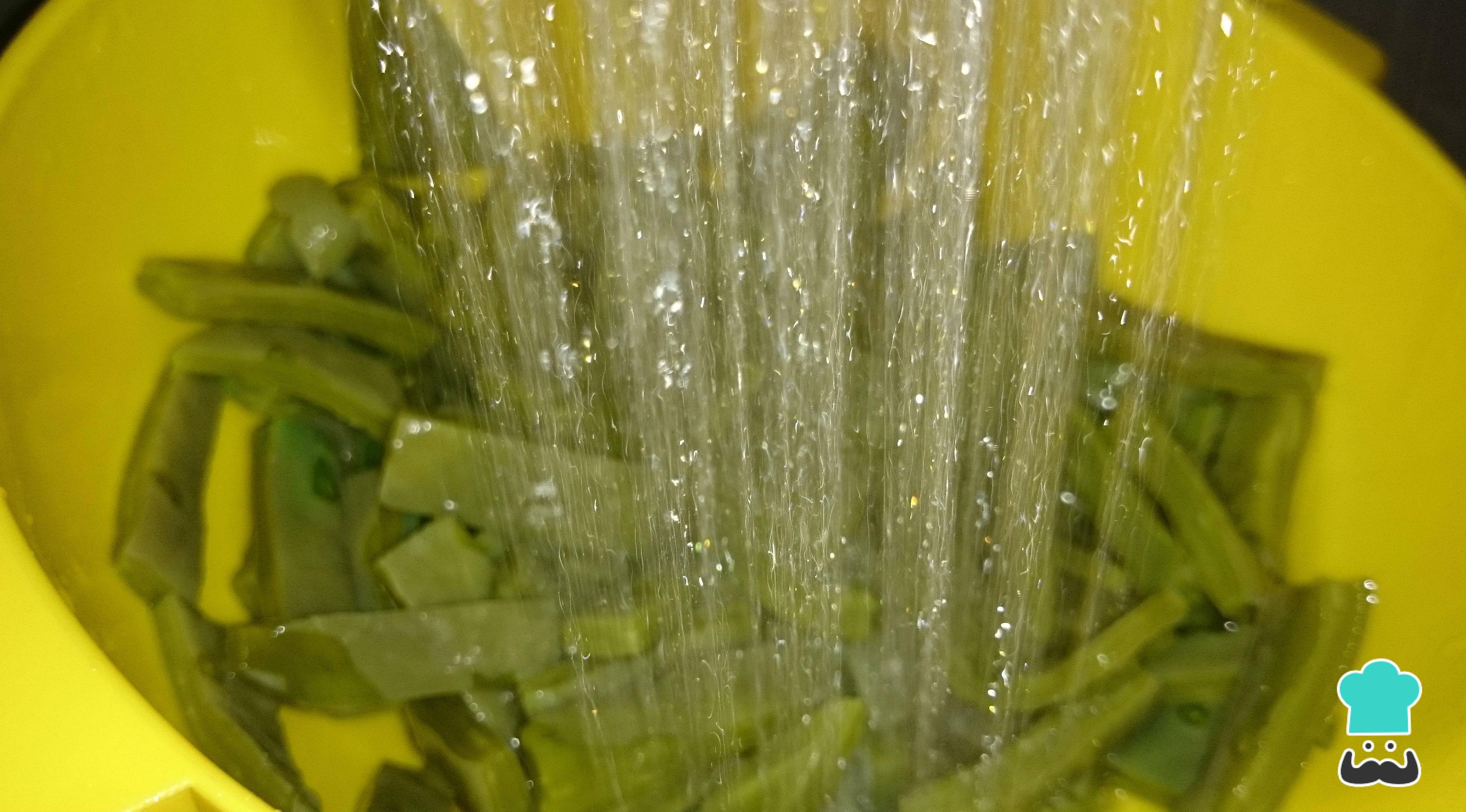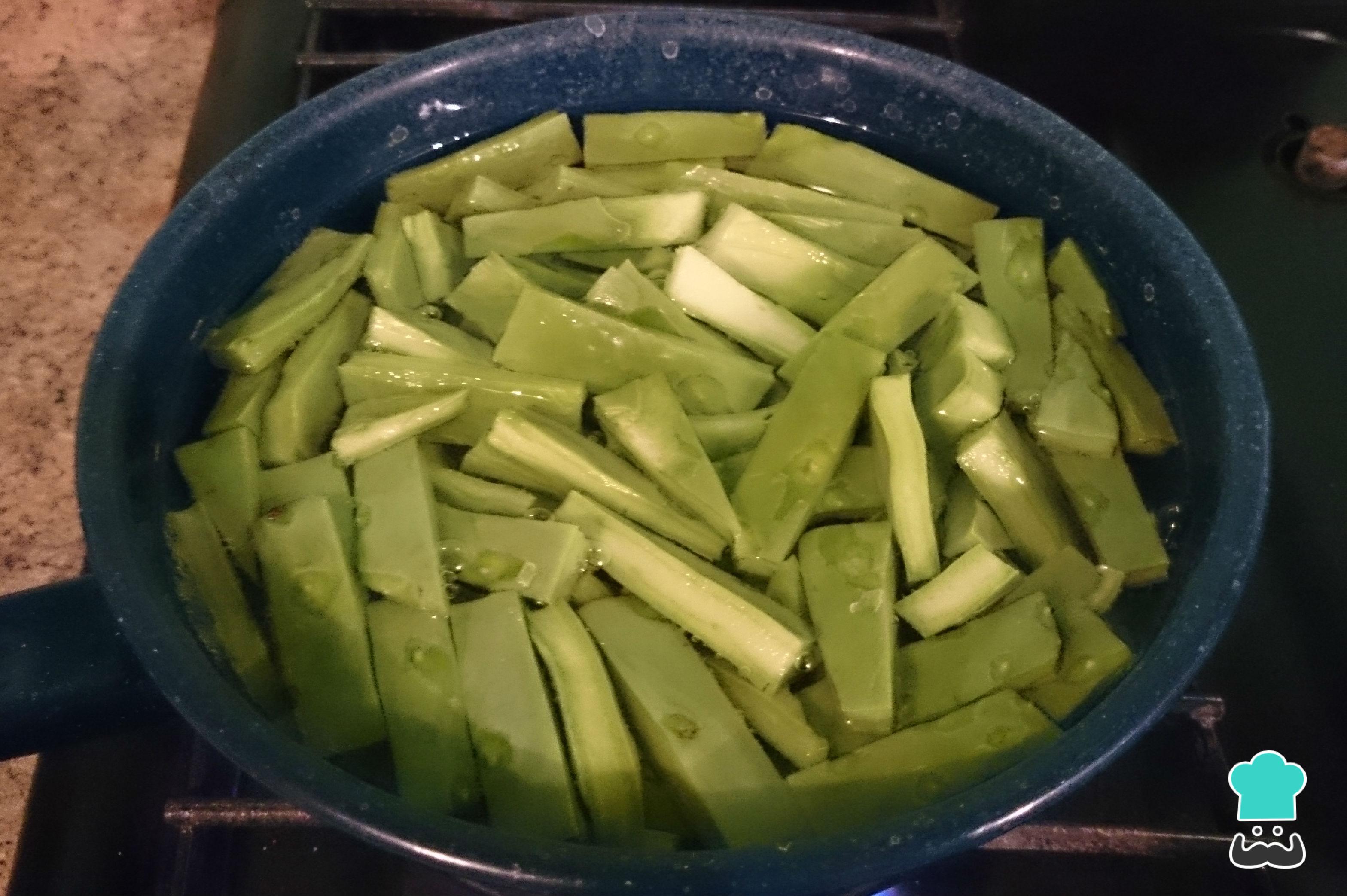 Para preparar esta receita tipicamente mexicana comece por cortar o nopal em tiras pequenas (semelhante à vagem) e lavar bem com água corrente.