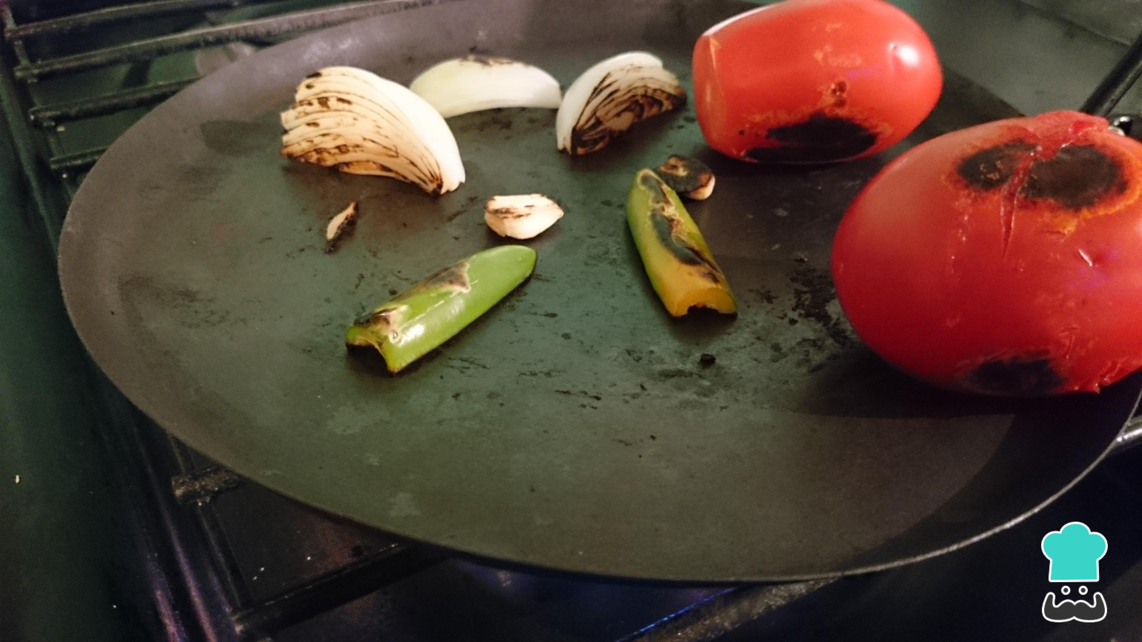 Para o molho vermelho, grelhe ou asse numa frigideira sem óleo os tomates, a pimenta, o alho e a cebola, até que fiquem como na fotografia.