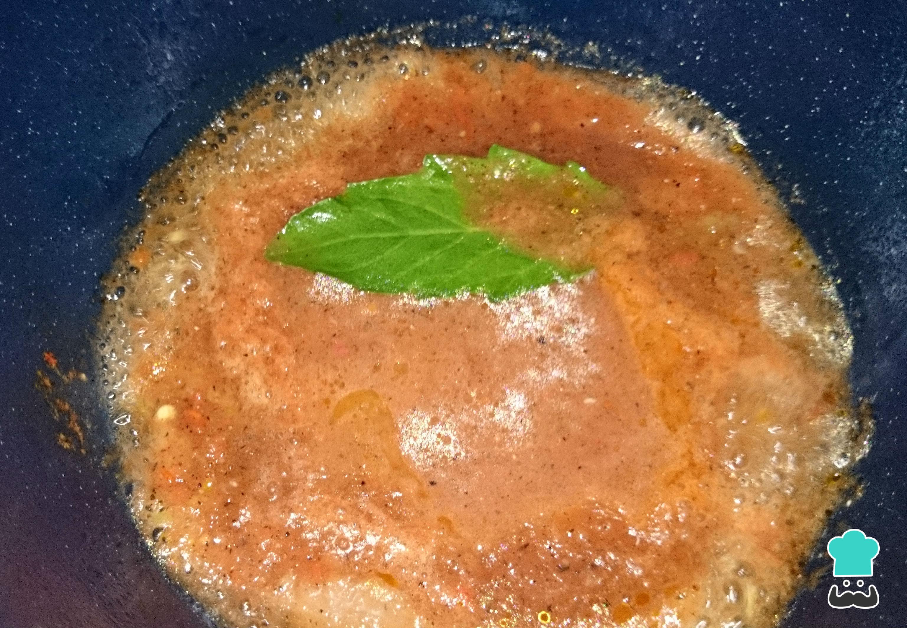 Quando os legumes deste nopal em molho de tomate estiverem prontos, bata-os no liquidificador com um pouco de água, e transfira para uma panela ao fogo médio. Adicione a erva-de-santa-maria, para aromatizar, e acrescente os nopales.