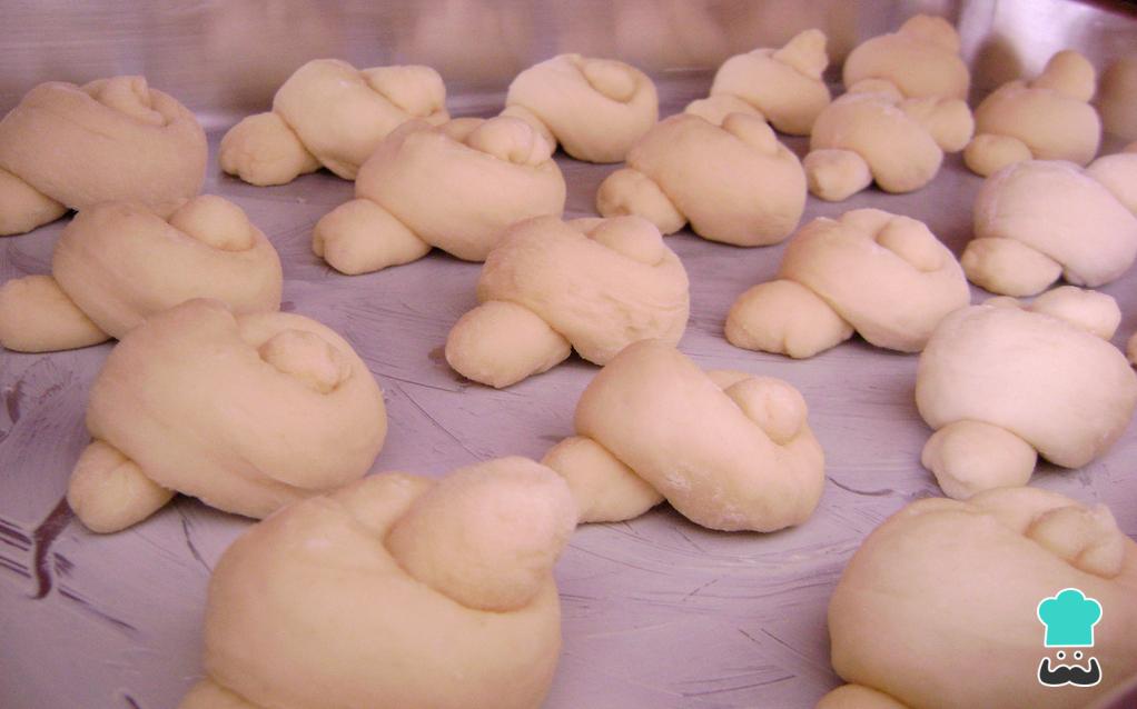 Após o tempo indicado a massa deverá ter dobrado de tamanho. Sove ligeiramente para retirar o ar, separe em pedaços pequenos e faça rolinhos com cada um deles. Com cada rolinho faça um nó, de modo a ficar como na fotografia. Coloque em um tabuleiro de forno untado e deixe crescer por mais 1 hora, assim ficarão bem macios!