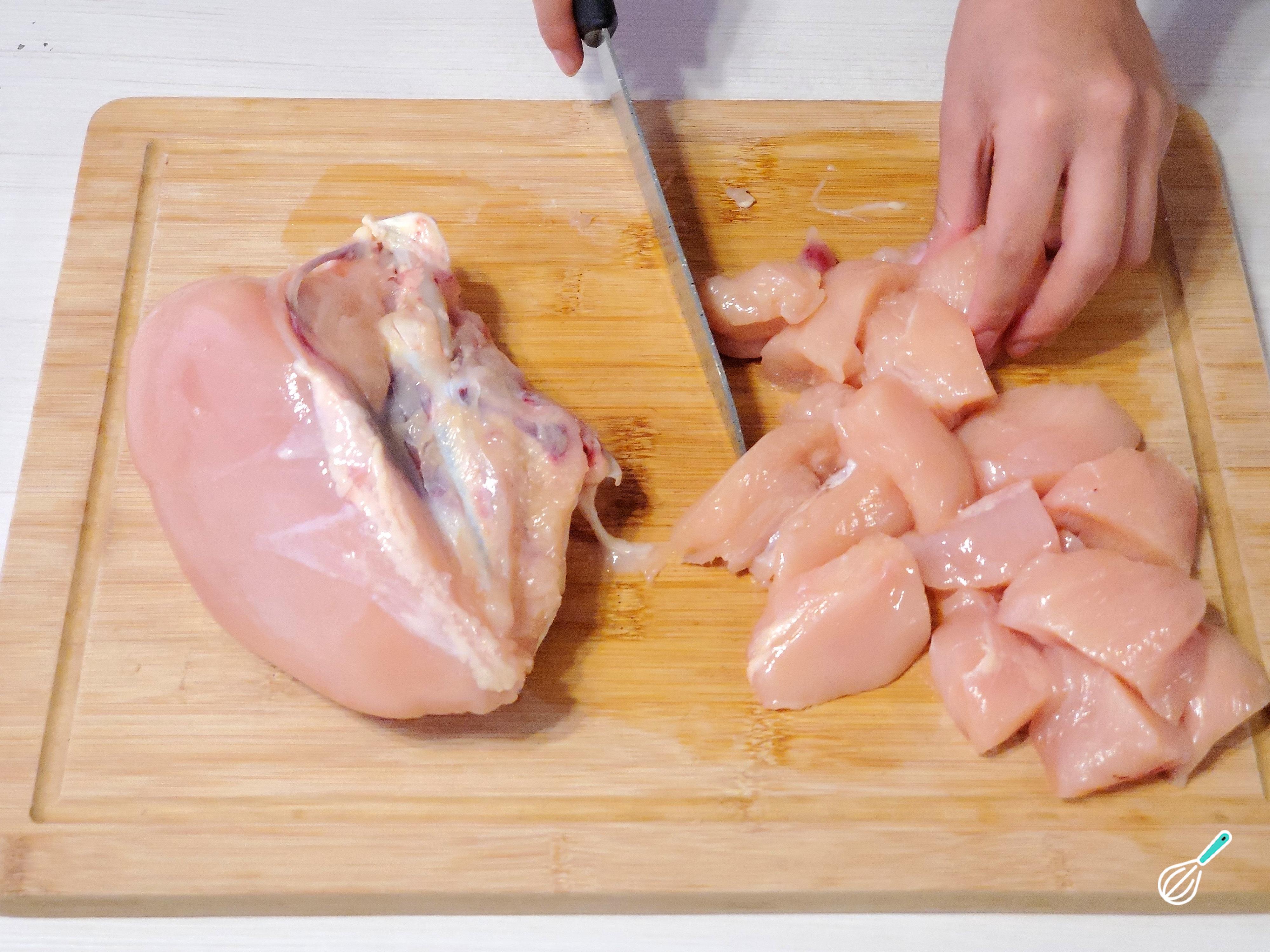 Comece limpando o frango e retirando todas as gorduras brancas e também a pele. Em seguida, retire o peito da carcaça passando a ponta da faca ao longo da lateral do osso. A seguir, corte em pedaços médios para facilitar a trituração no processador.
