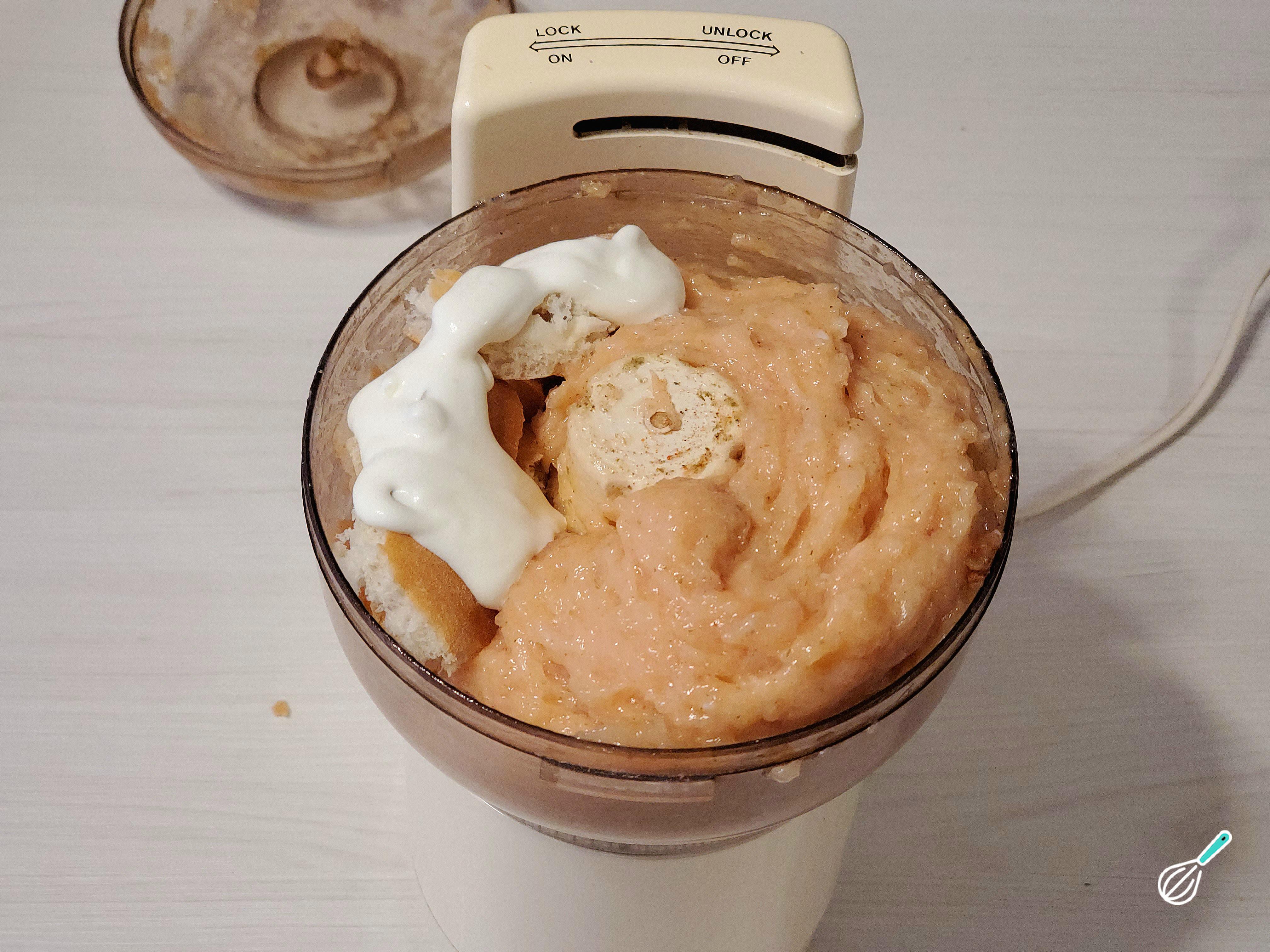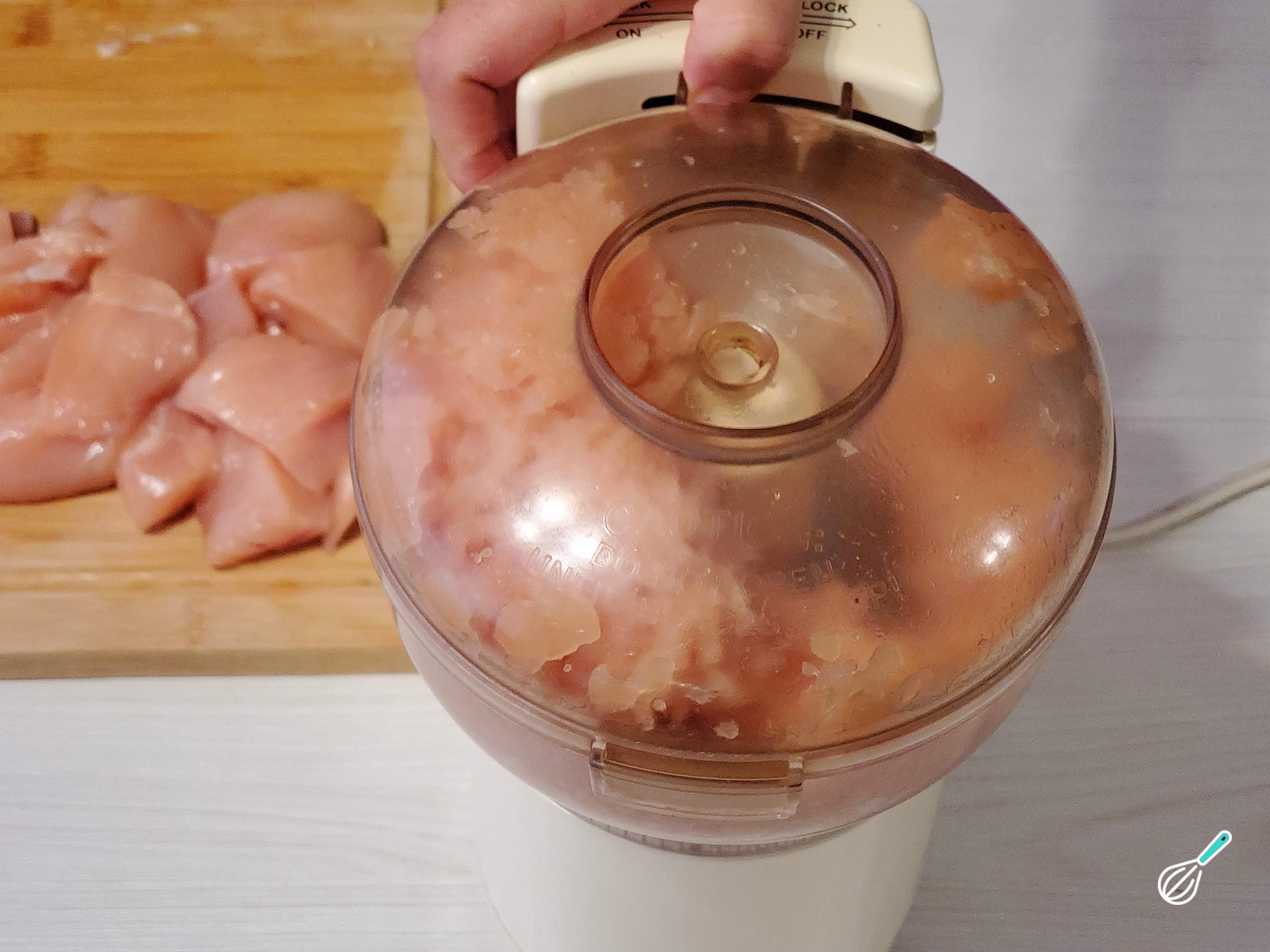 Coloque o frango no processador de alimentos e comece a bater até ficar parecido com uma pasta. Se sobrar frango, faça aos poucos e reserve o frango em uma tigela grande para temperar depois.