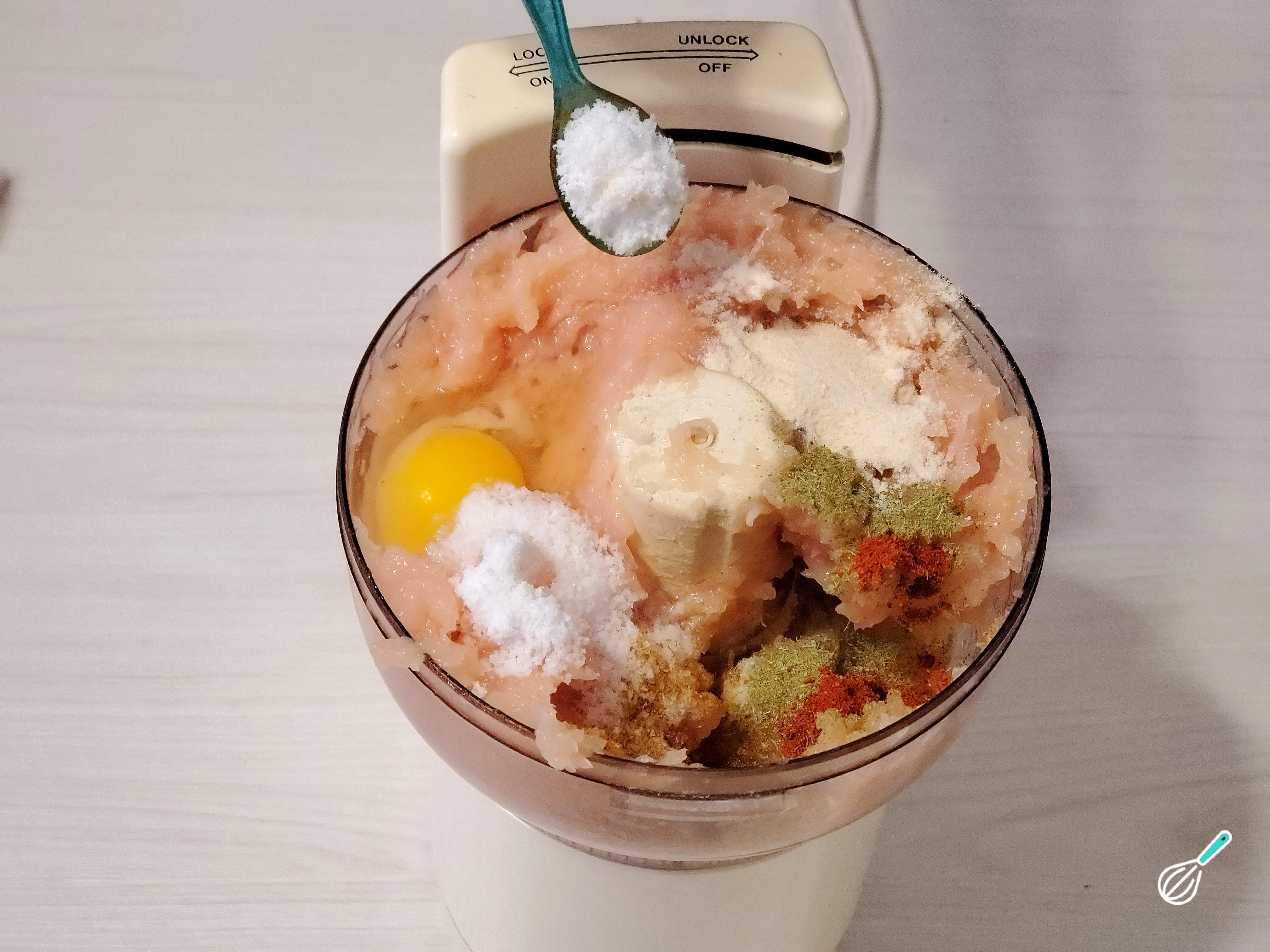 Adicione os temperos e ervas secas, que são: sal, pimenta moída, cominho moído, alho em pó, páprica defumada em pó e orégano seco. Adicione também um ovo e misture até ficar integrado.