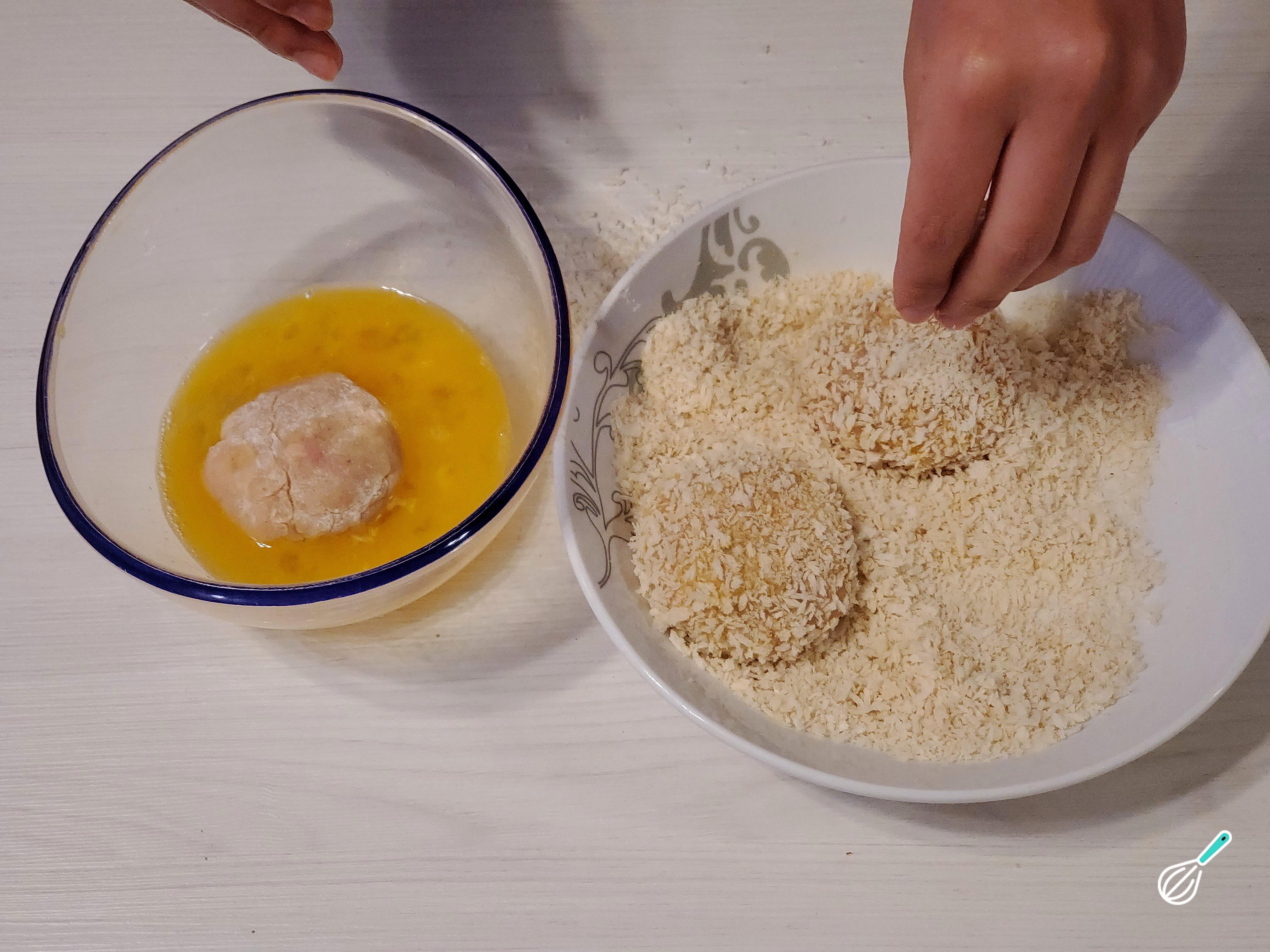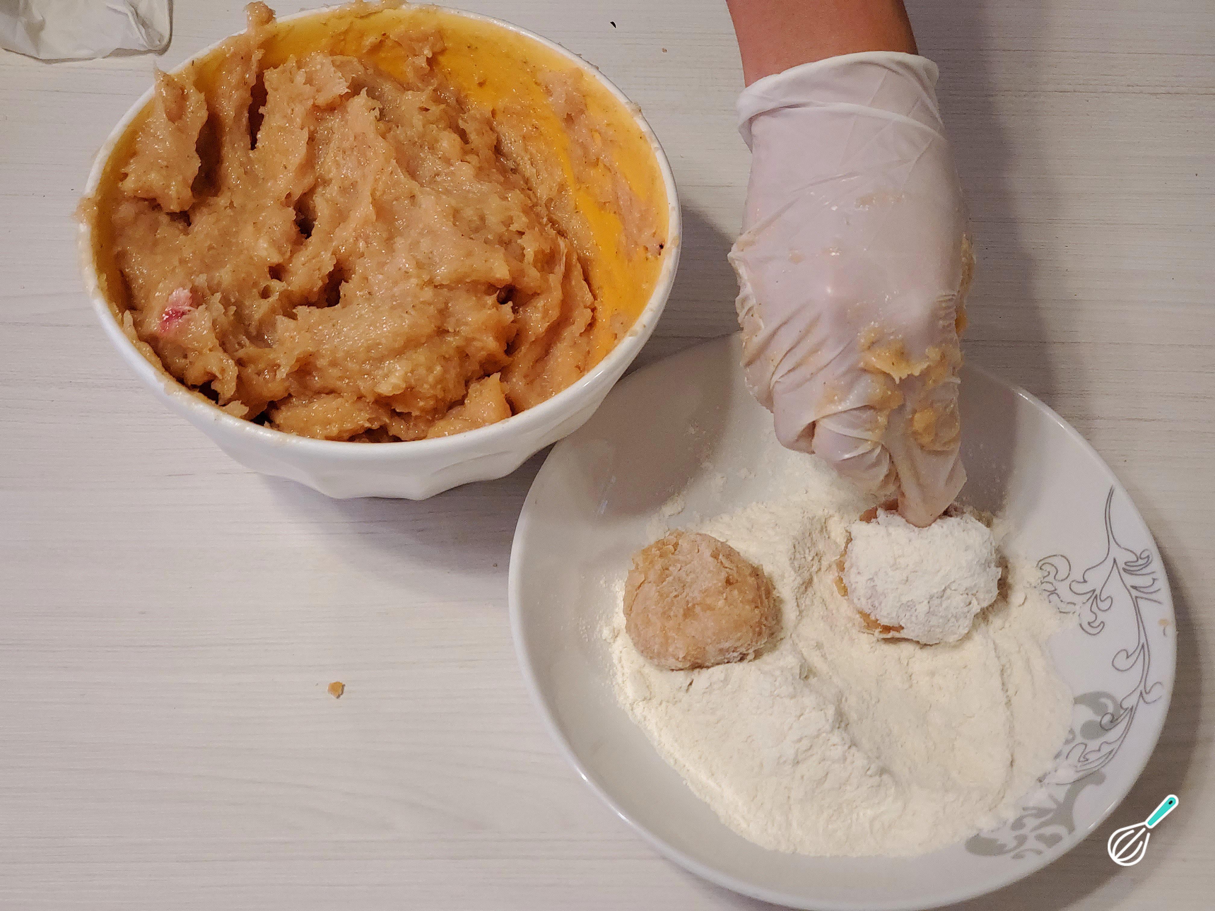 Agora que a pasta de frango está bem temperada, prepare 3 recipientes, um com farinha, outro com ovo batido e o último com panko ou farinha de rosca. Em seguida, unte as mãos com um pouco de azeite (pode ser óleo) e faça bolinhas com a pasta de frango. Deixe-os imediatamente na tigela de farinha para dar-lhes um formato bonito.