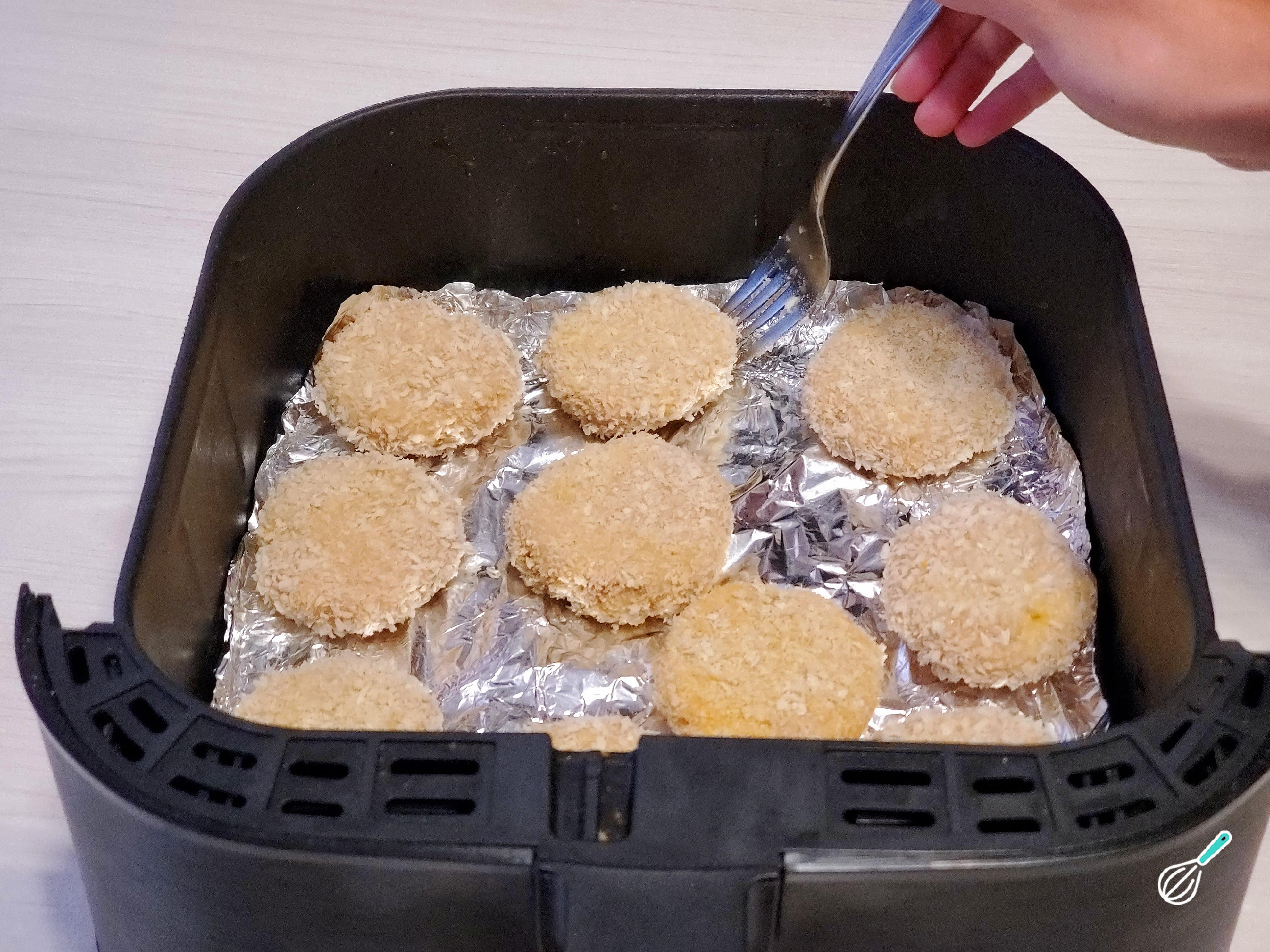 Coloque os bolinhos de nuggets caseiro dentro do cesto da airfryer e adicione um pouco de óleo por cima para que pareçam fritos. Se você não tiver um spray de óleo, poderá usar um pincel com azeite para obter o mesmo efeito.