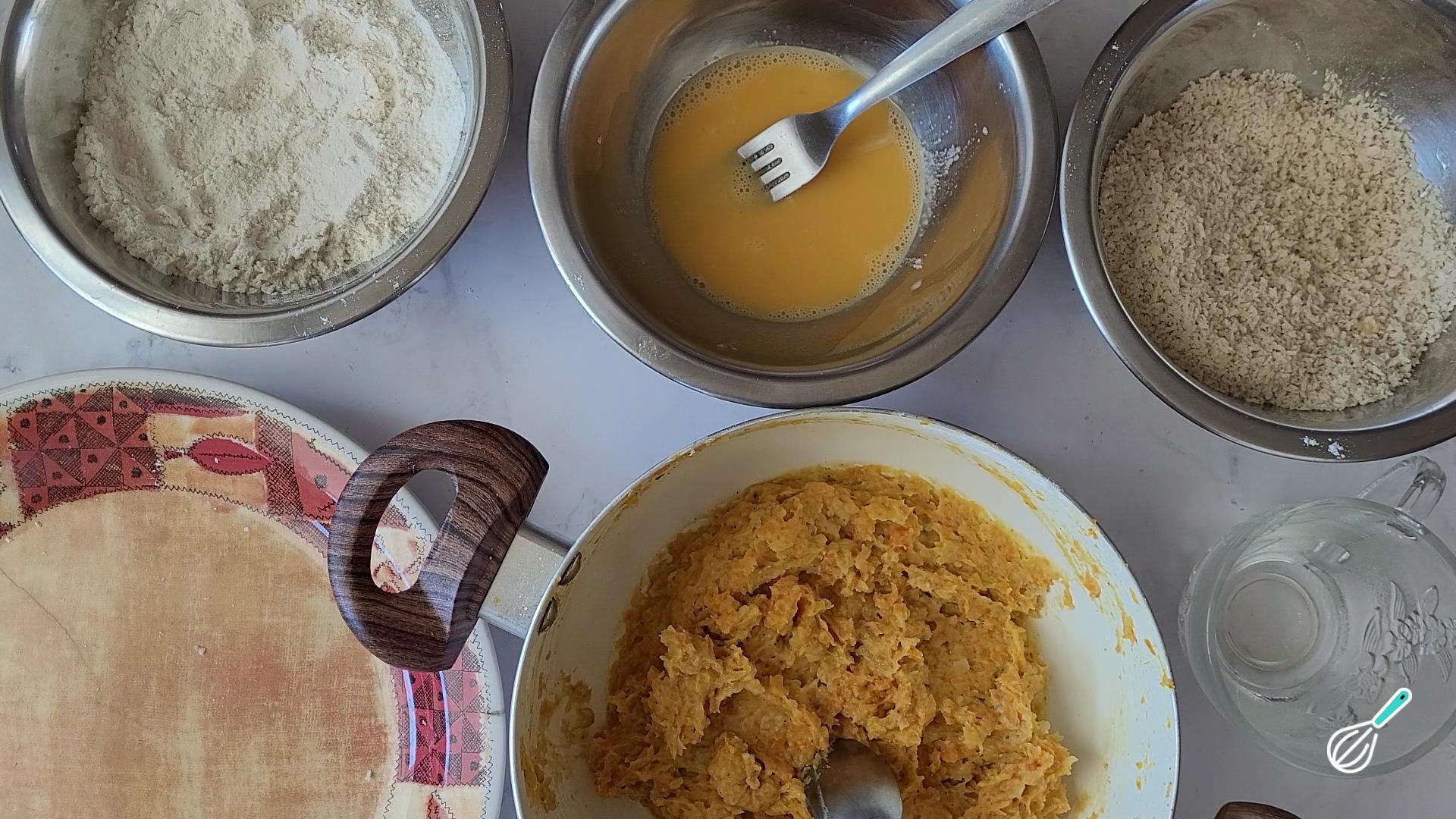 Passe a massa na farinha de trigo, no ovo e finalize na farinha panko. Deixe descansar em um prato enquanto repete o processo.