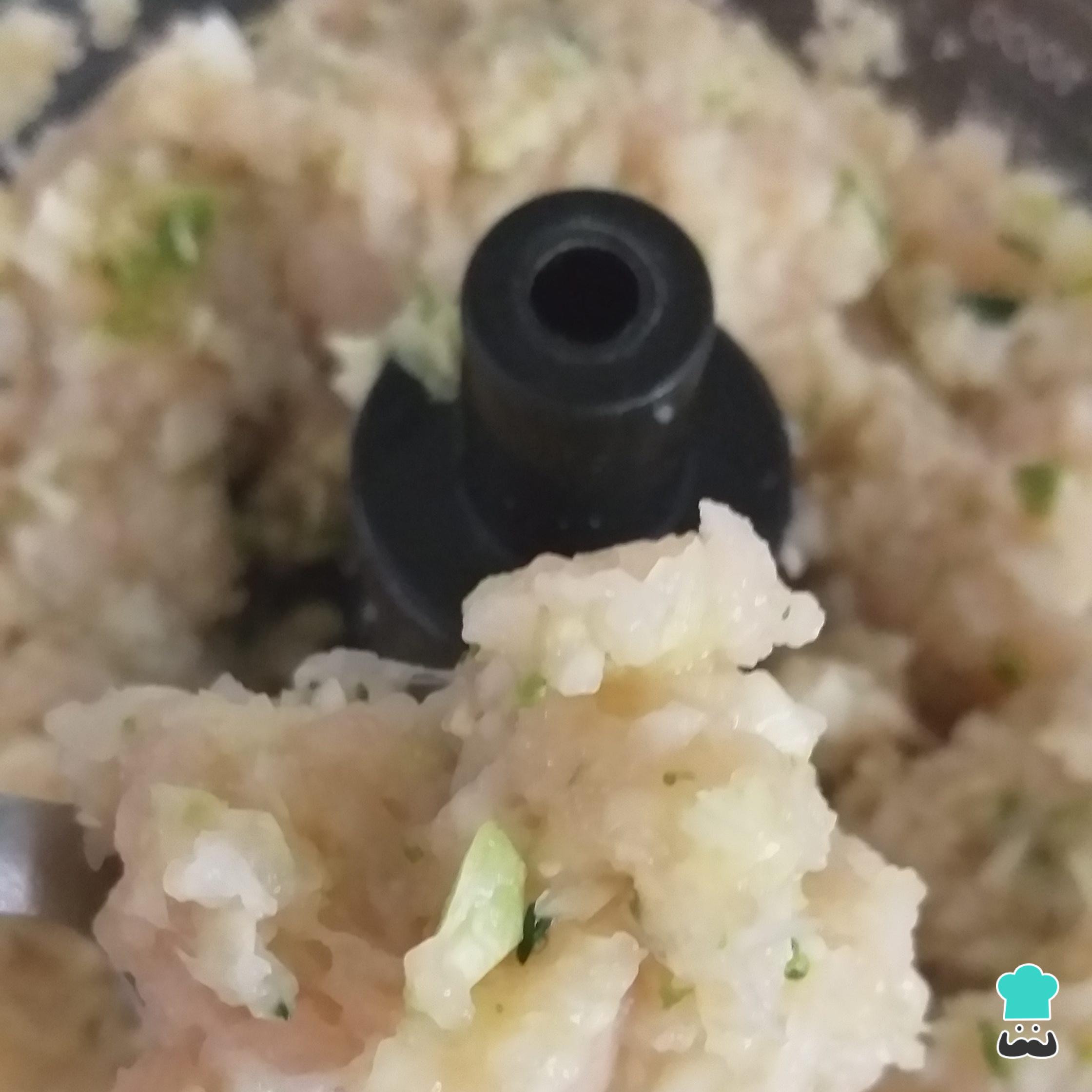 Coloque no processador o frango picado cru, a salsinha/cebolinha, a cebola, a abobrinha e o sal. Bata até obter uma mistura homogênea.