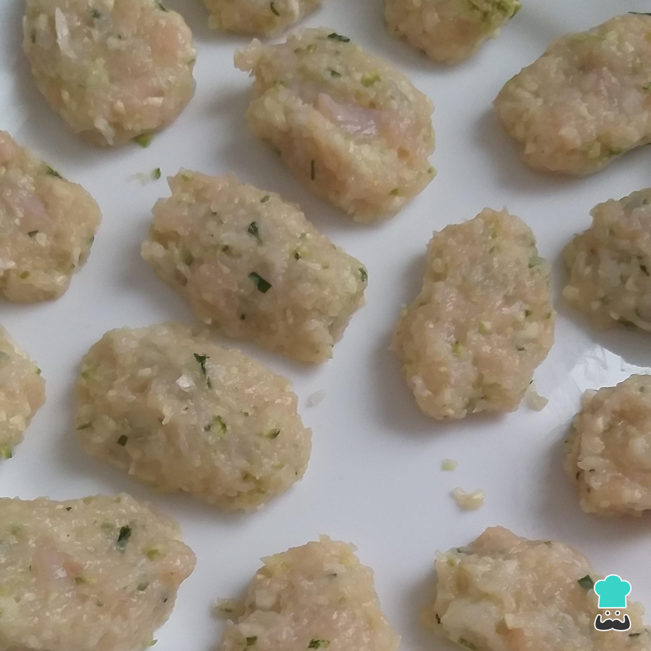 Dica: unte suas mãos com óleo vegetal ou azeite, para a massa dos nuggets caseiros não grudar na hora de modelar.