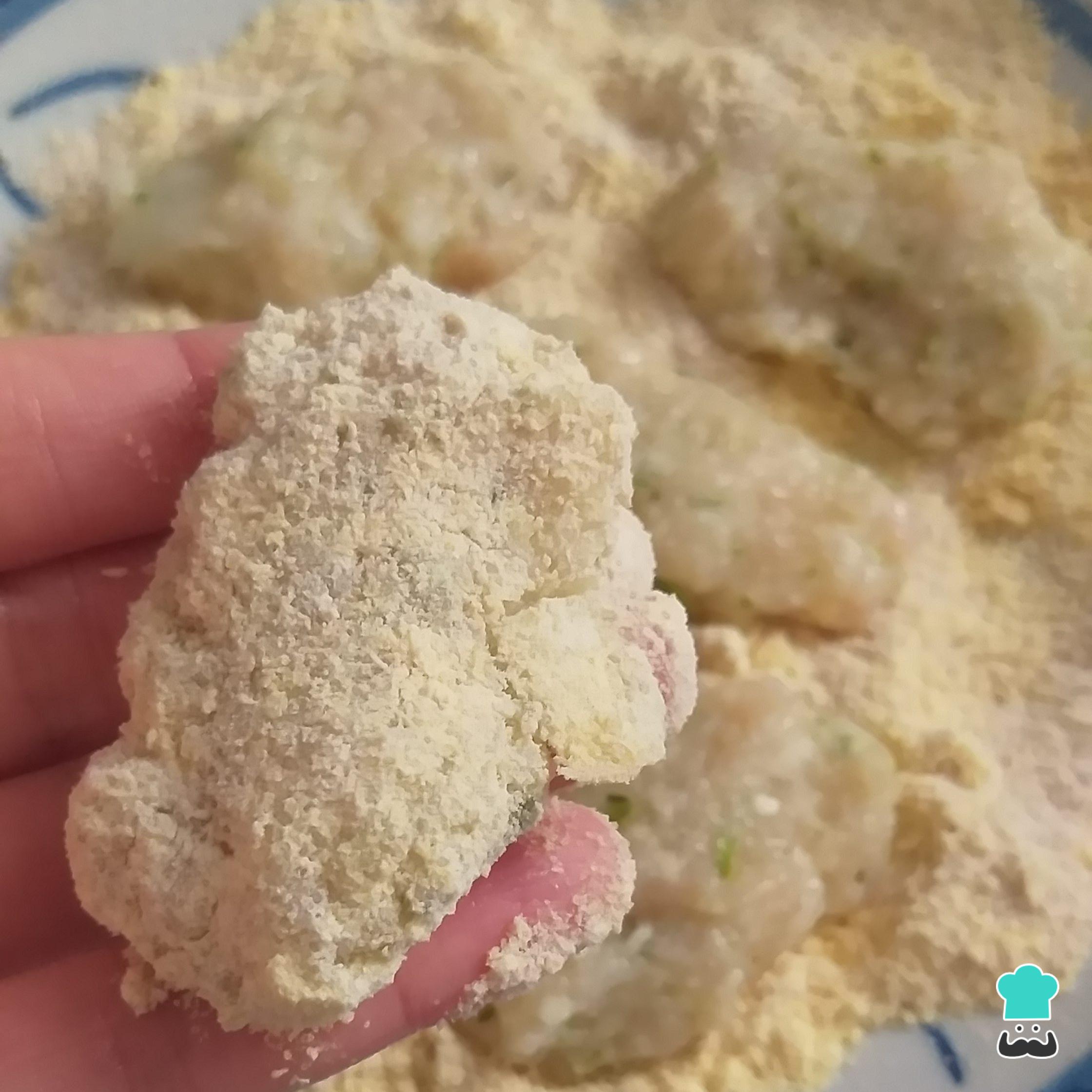 Empane com a farinha (não precisa passar no ovo antes), que poderá ser rosca, linhaça, milho ou aveia. Pressione ligeiramente com os dedos, para a farinha grudar bem.