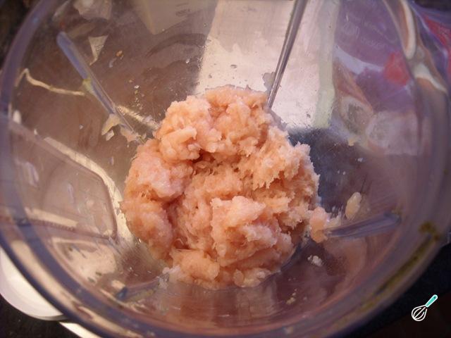 Para preparar nuggets de frango crocante, comece por colocar o peito de frango, a cebola, a salsinha, a cebolinha, o sal e o alho no liquidificador. Bata tudo até obter uma pasta uniforme, junte o ovo e volte a bater tudo.