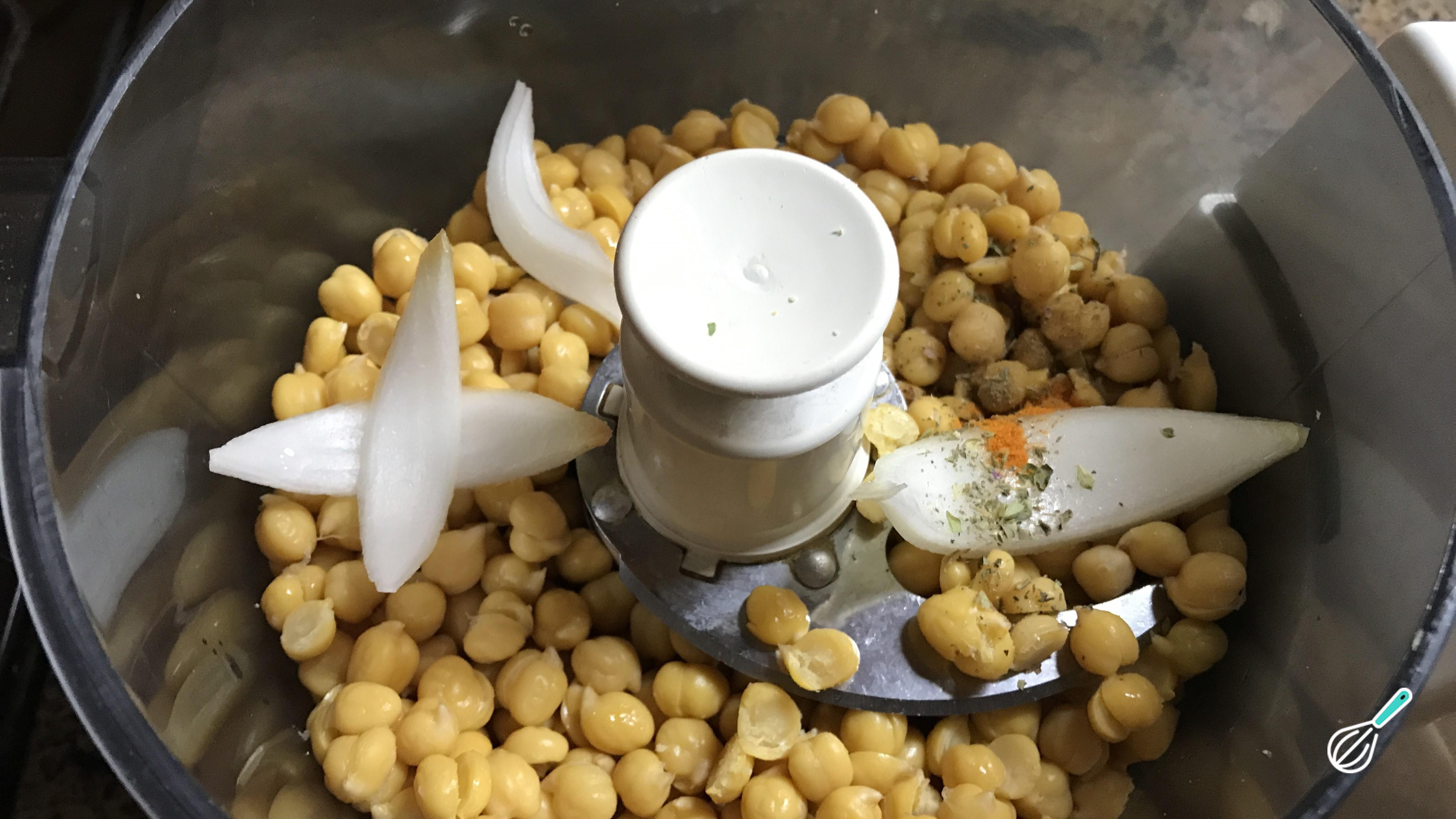 Adicione a cebola descascada e os temperos antes de processar o grão de bico. Você pode usar os propostos nesta receita ou os que você mais gosta. A cebola dará um sabor muito semelhante aos nuggets de frango.
