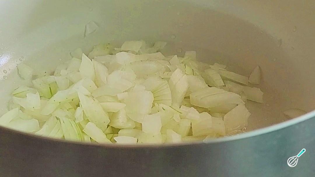 Na panela, coloque o óleo e o alho e deixe fritar. Acrescente a cebola, misture e deixe refogar.