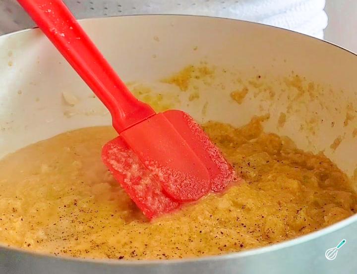 Acrescente o milho batido, a pimenta-do-reino e o sal. Mexa, em fogo baixo.
