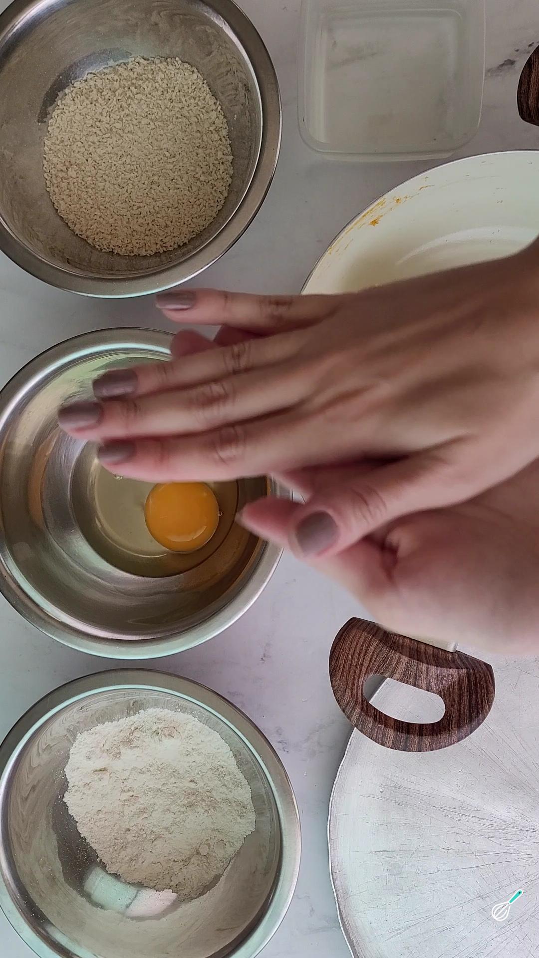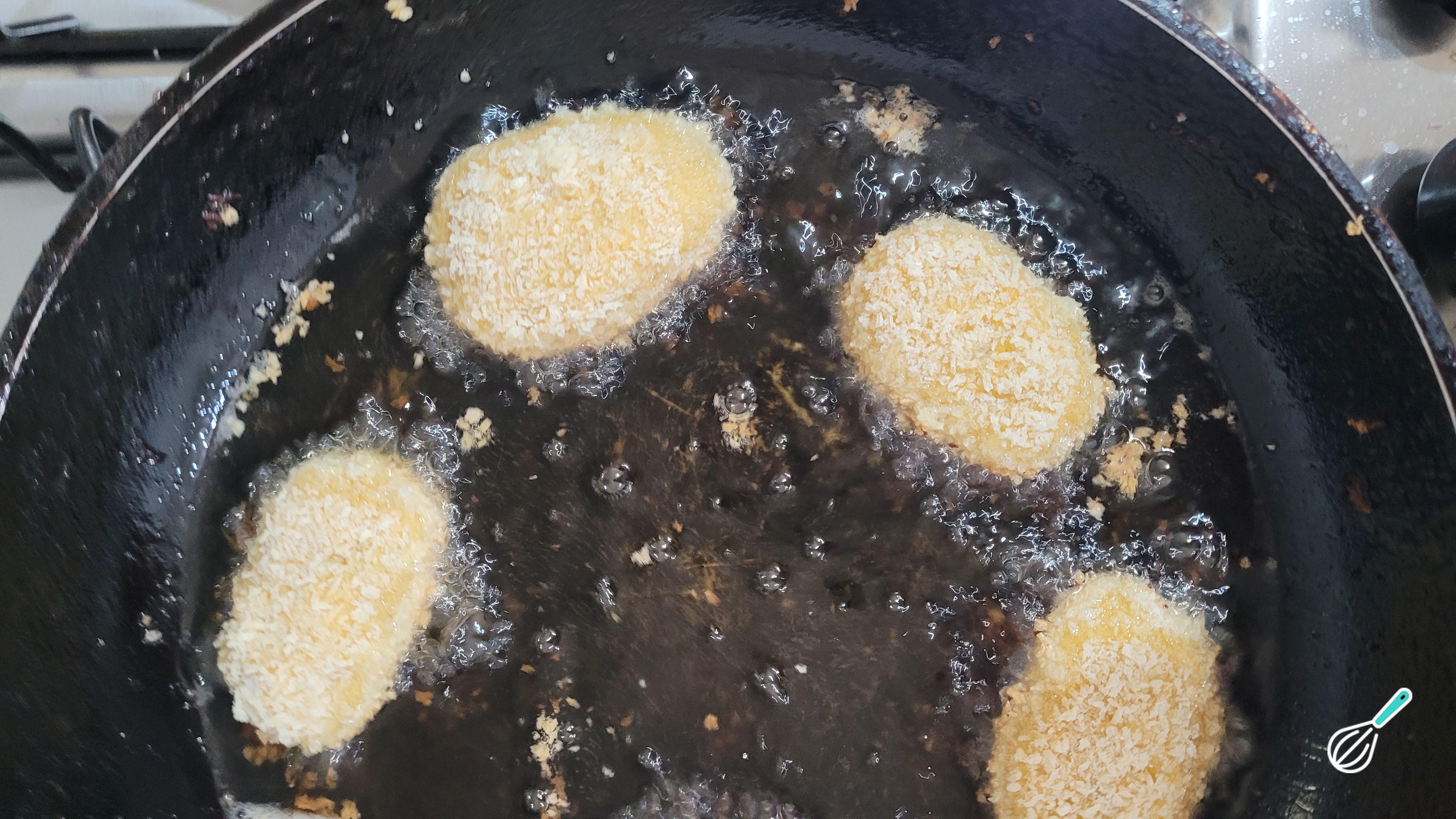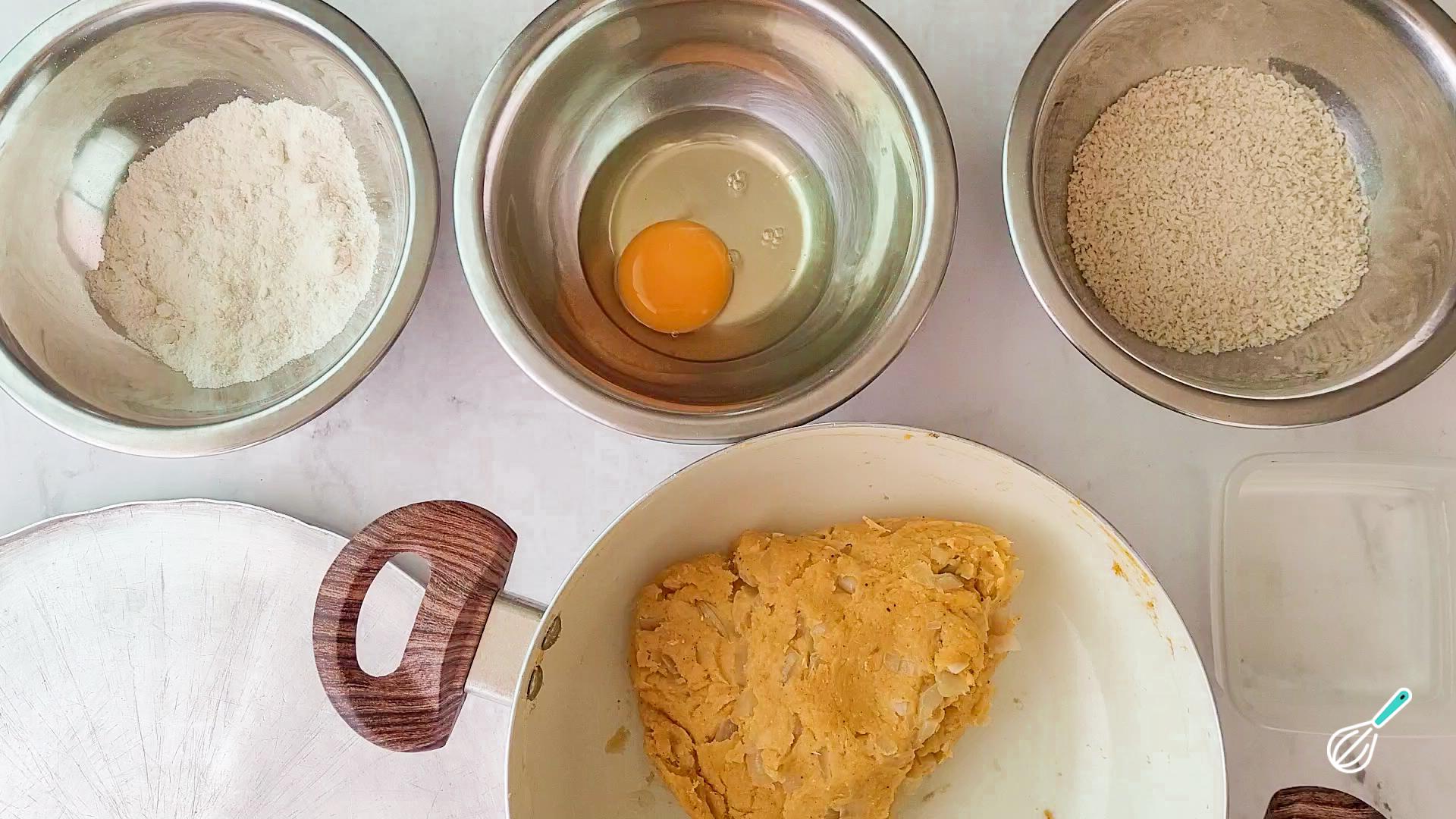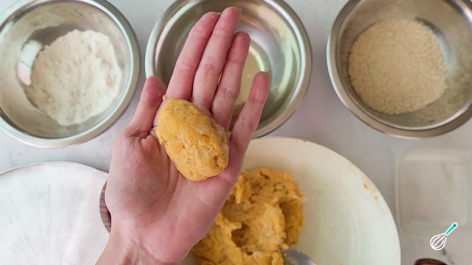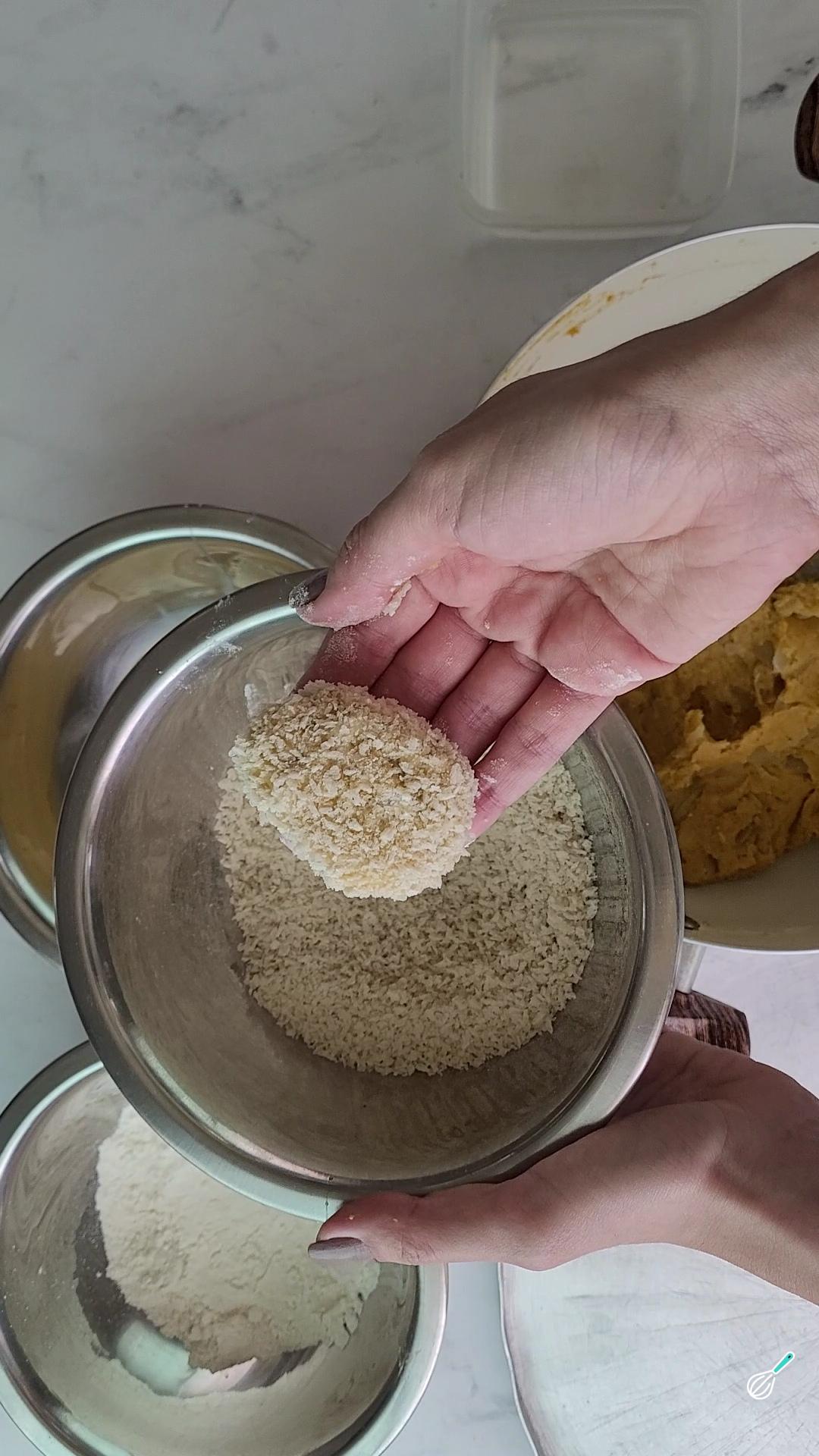 Passe na farinha de trigo, no ovo e finalize na farinha panko. Deixe descansar em uma forma. Repita o processo com toda a massa.