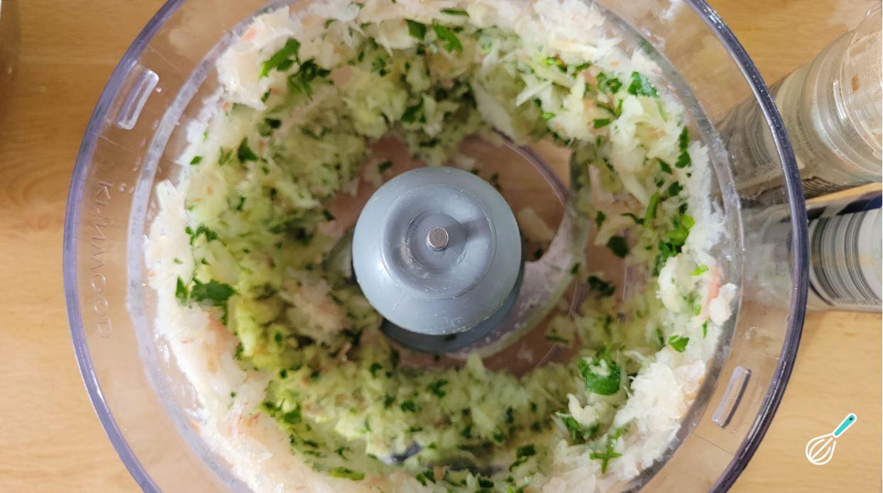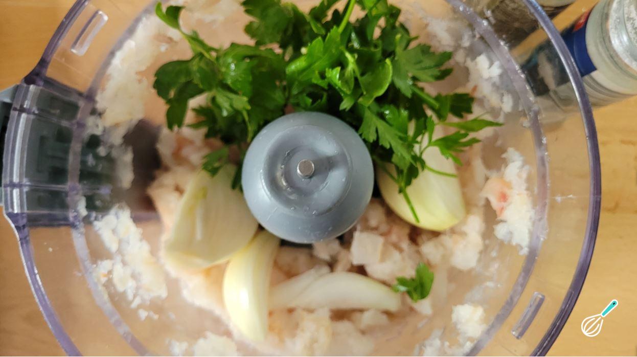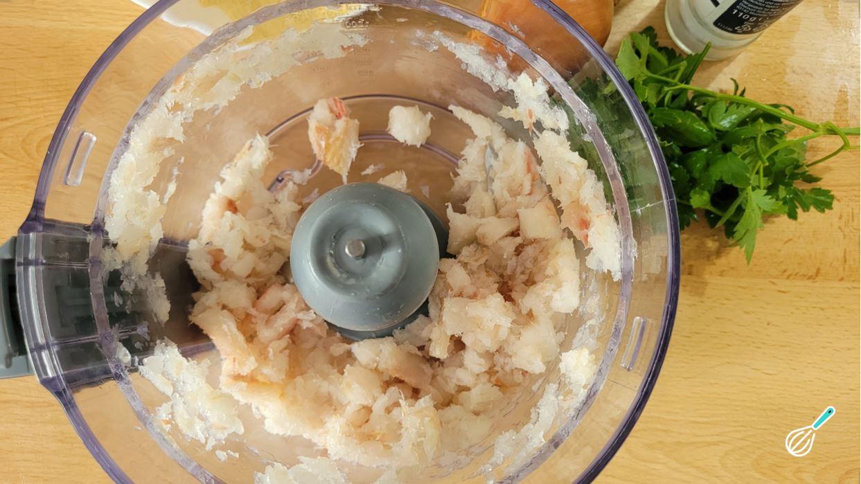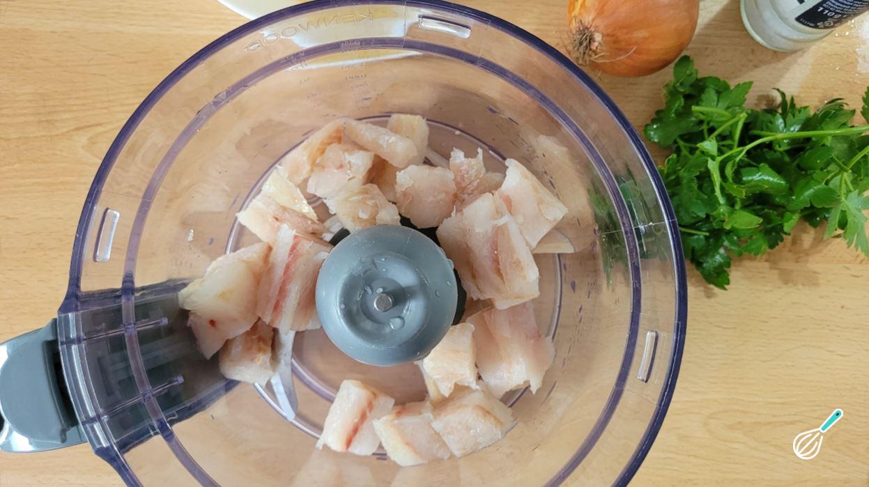 Coloque o peixe em um processador. Se seu peixe estiver congelado, você pode cortar em cubos antes de descongelar totalmente, mas deixe descongelar totalmente antes de bater no processador. Se estiver com muita água, antes de bater, seque com um papel toalha para tirar o excesso de água.