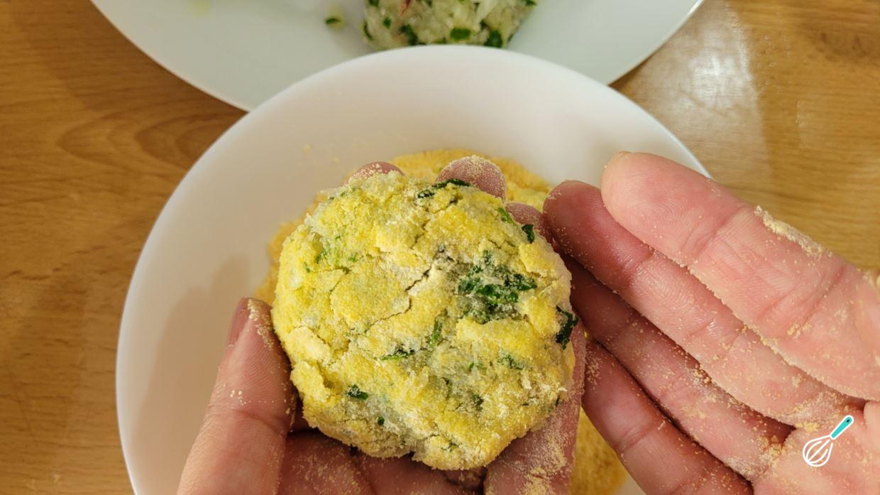 Quando terminar de modelar, empane os nuggets no fubá, fazendo uma camada fina e homogênea, de forma que fique todo coberto, mas retirando o excesso. Não é necessário adicionar ovo, porque a própria umidade dos ingredientes ajuda a grudar o fubá.