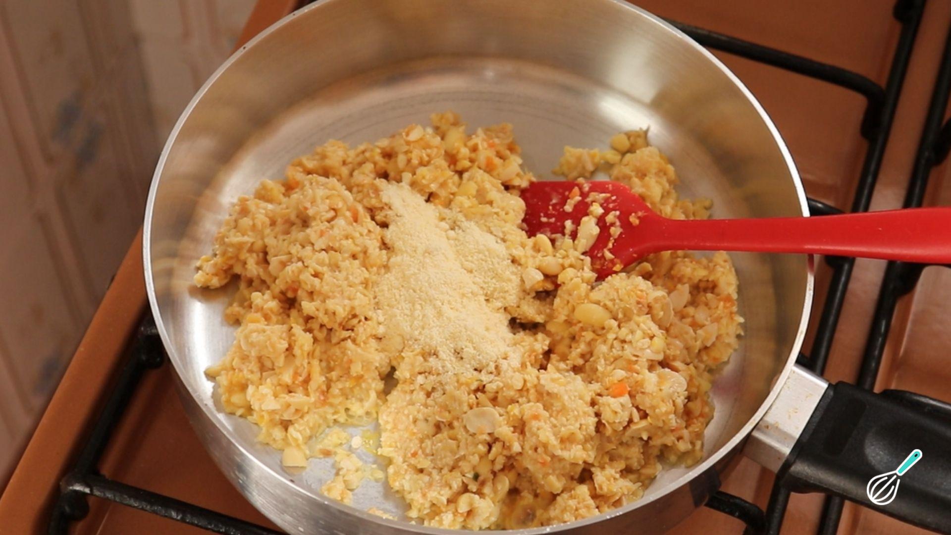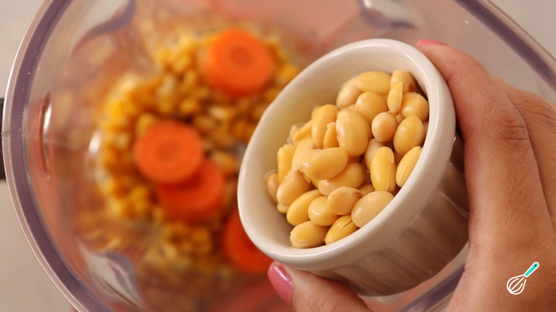 Vamos começar? Bata os grãos de soja já cozidos com o milho e a cenoura no liquidificador, até formar uma pasta.