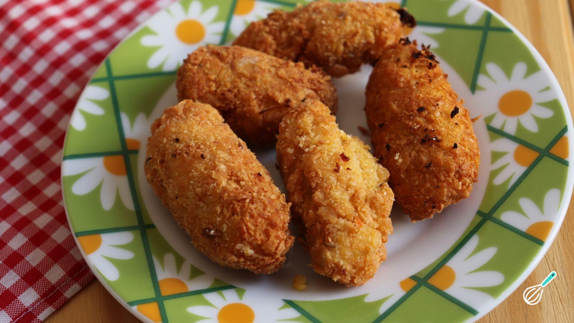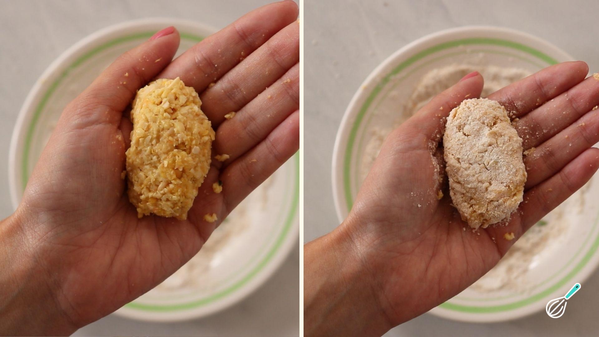 Agora, com a massa pronta, faça bolinhos no formato de nuggets e passe na farinha de rosca.