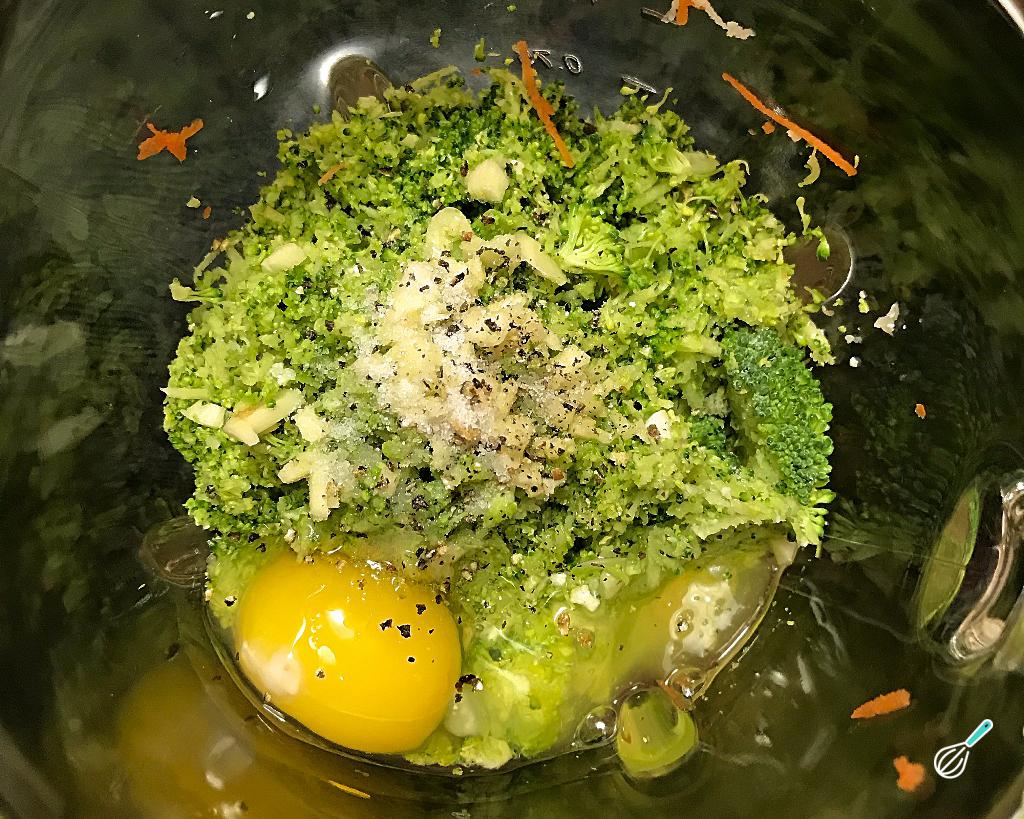 Comece batendo no liquidificador o ovo, o brócolis, a couve flor, a cenoura, o alho e os temperos (sal, pimenta, alho em pó, cebola em pó). Bata só até tudo ficar misturado - não é para virar um creme.