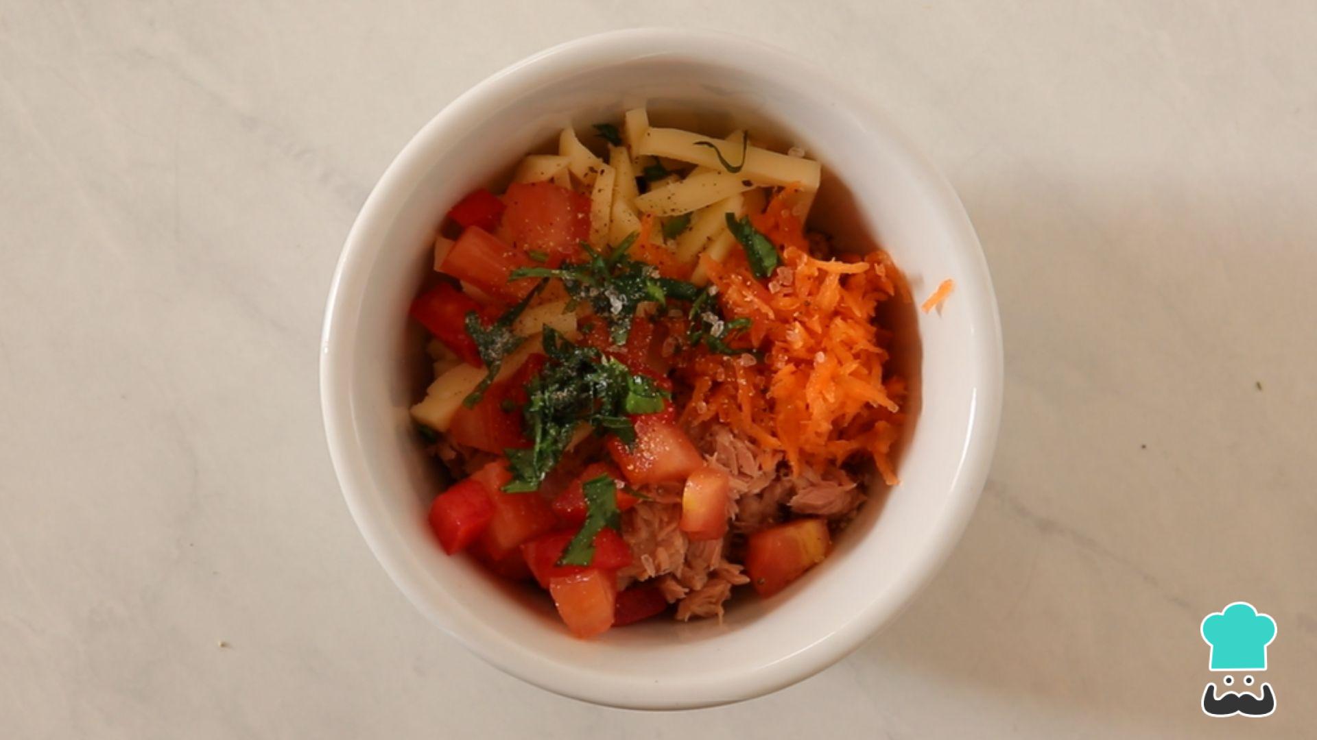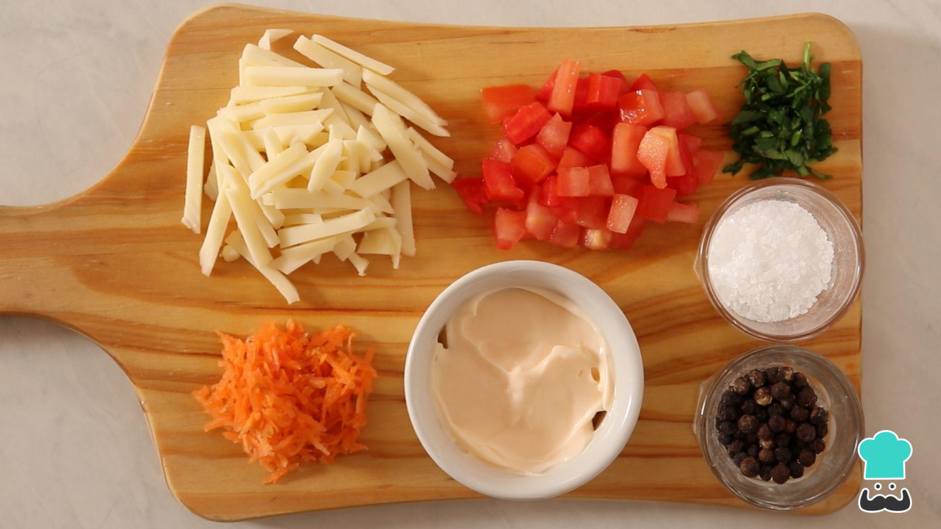 Para preparar essa receita fácil com atum em lata, comece separando os ingredientes. Pique a salsinha, rale a cenoura e a muçarela e corte o tomate em cubos.